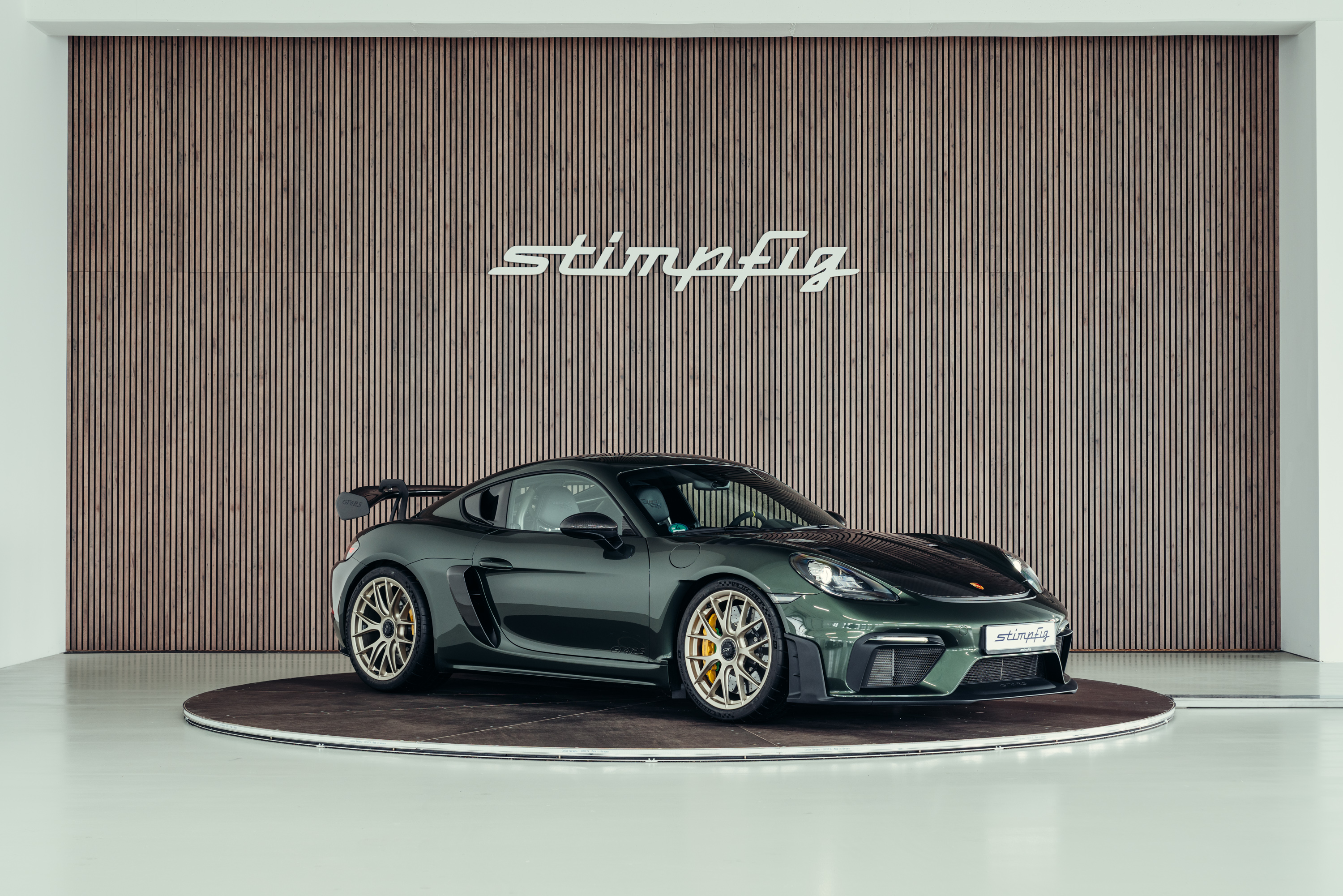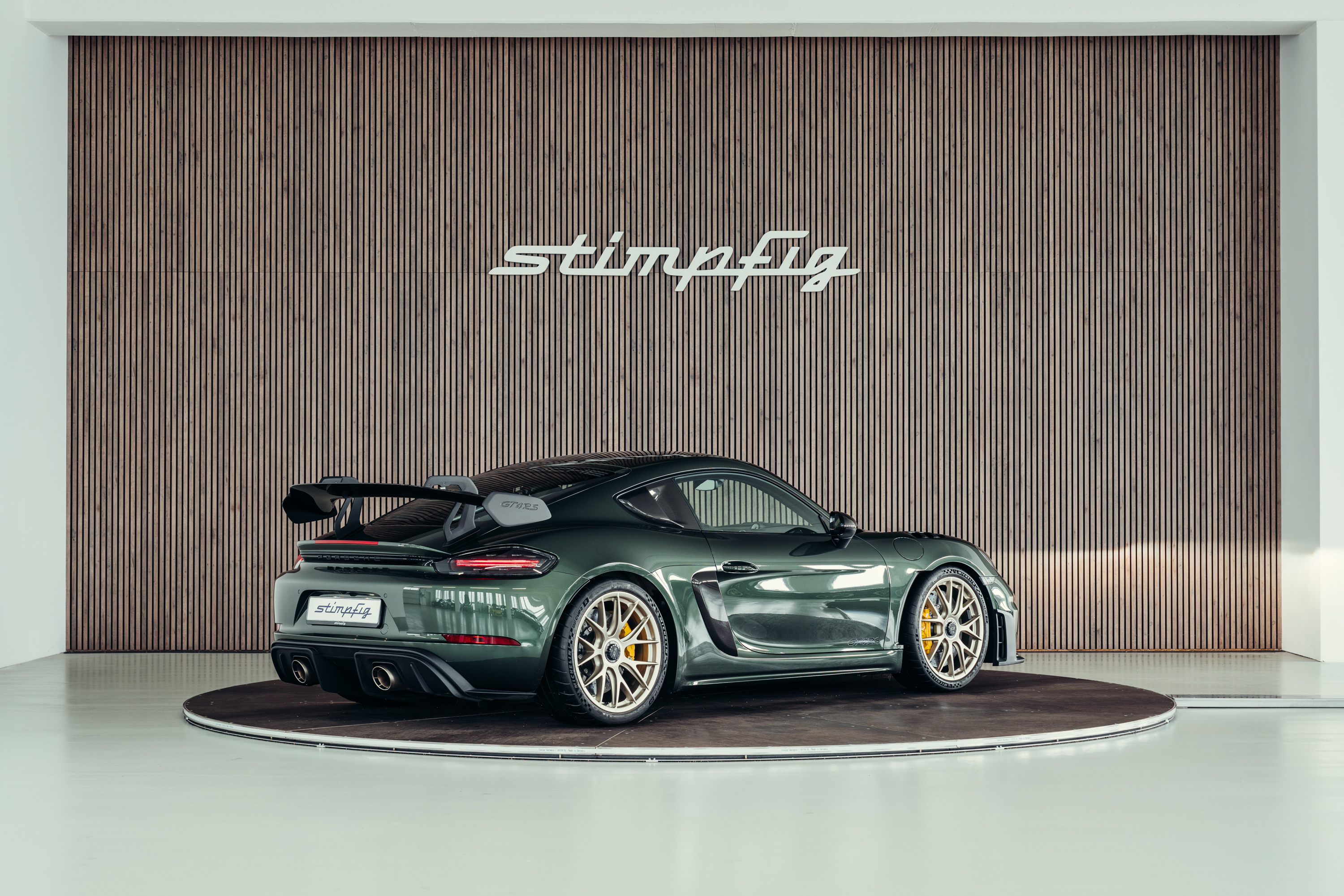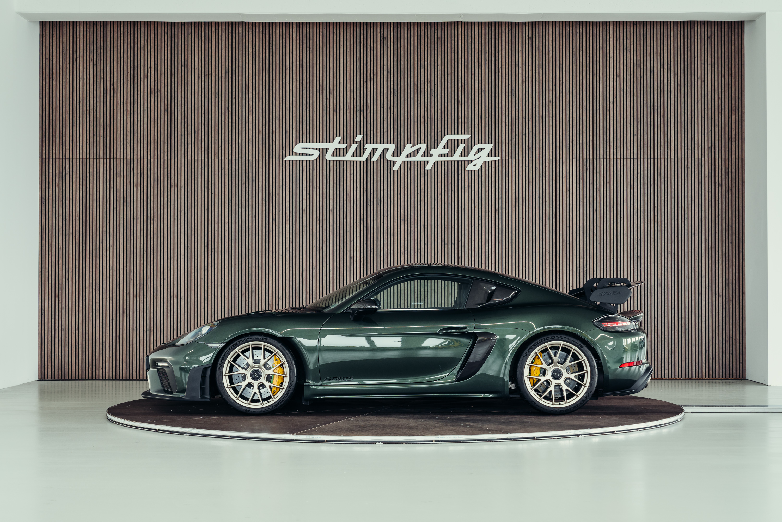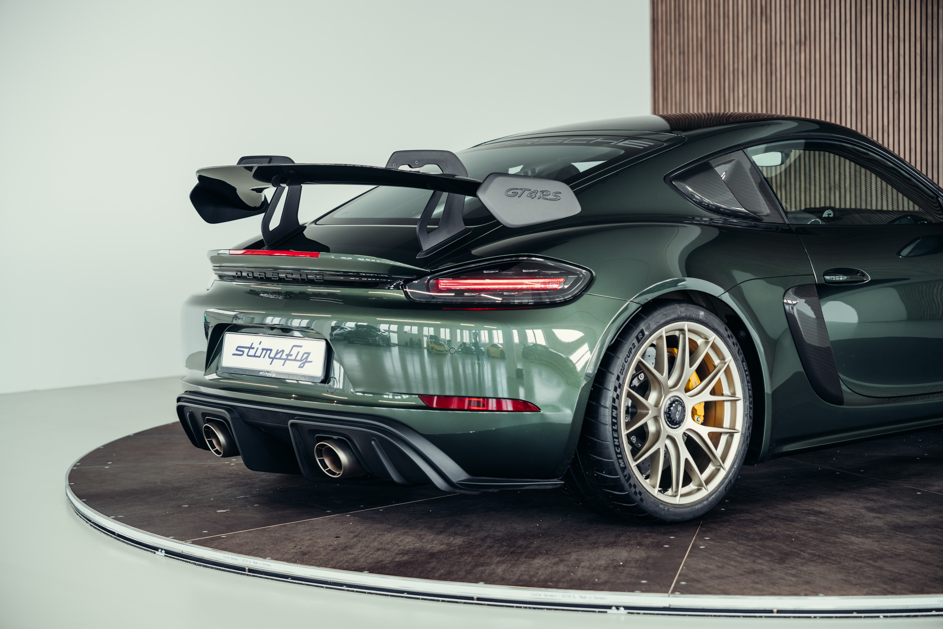 Zum Verkauf steht ein sehr gepflegter Porsche 718 Cayman GT4 RS in der exklusiven PTS-Sonderfarbe „Oakgreenmetallic“.