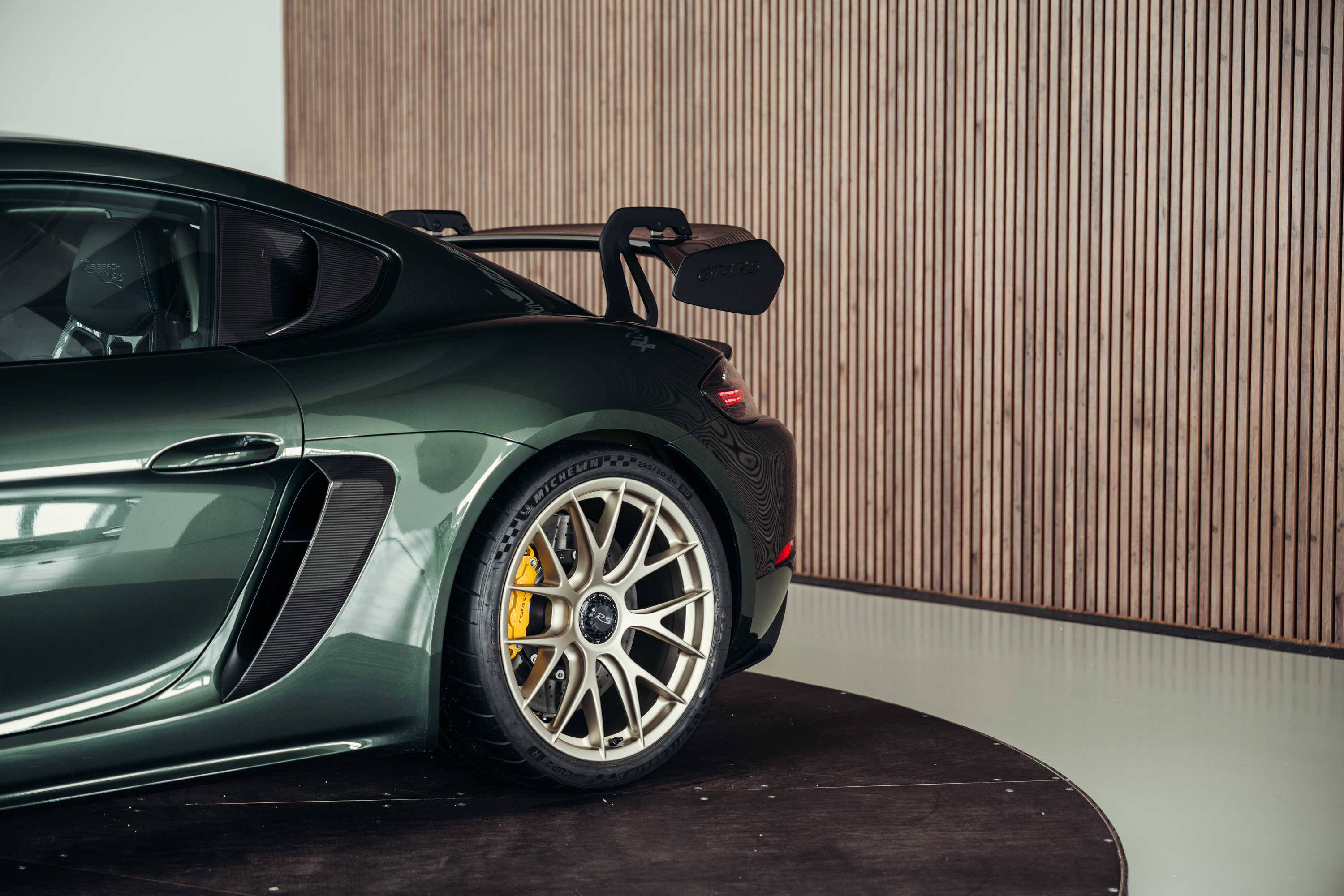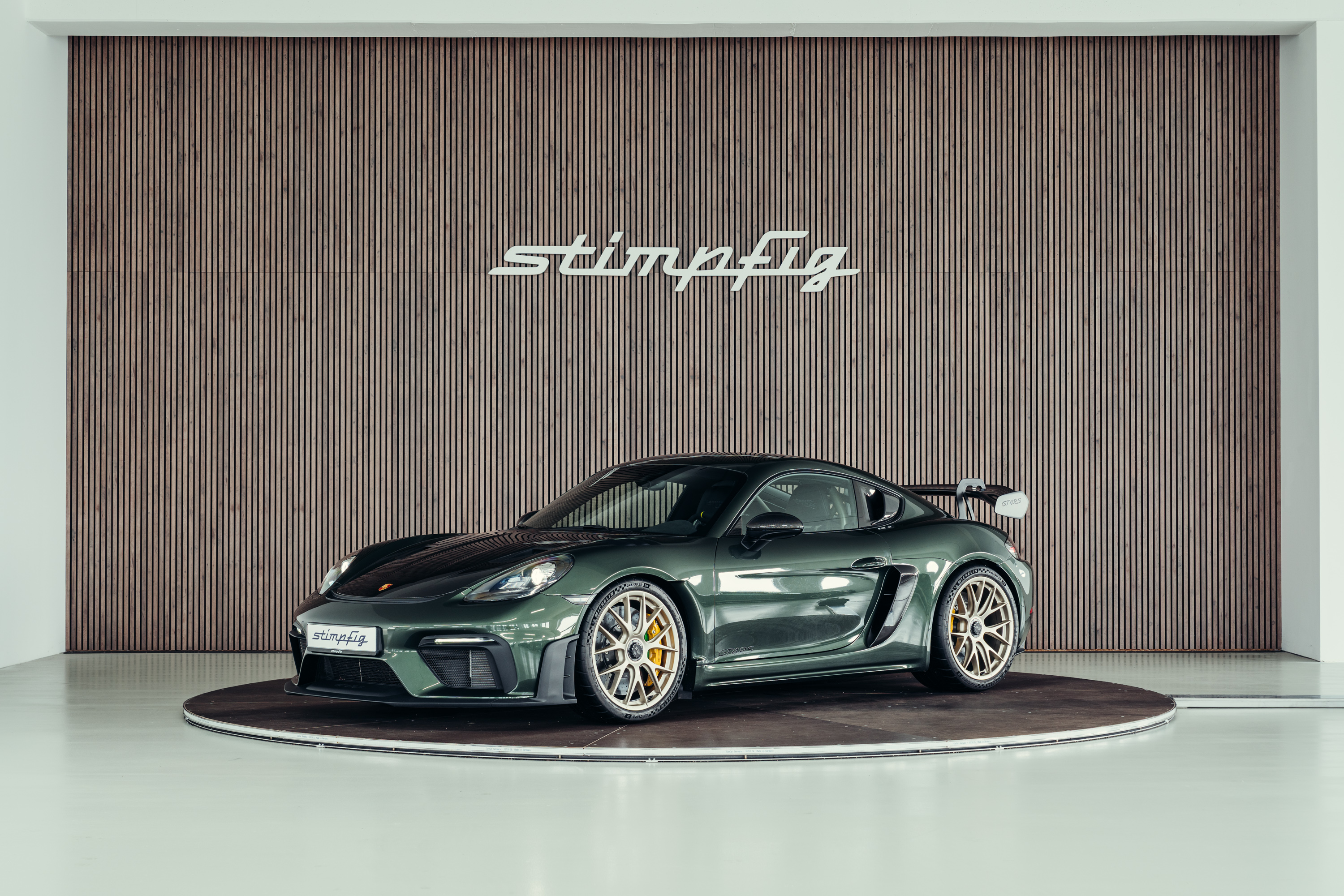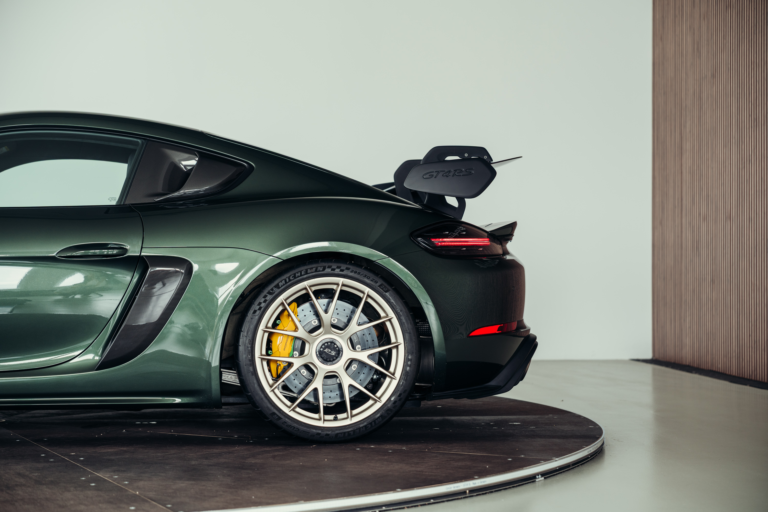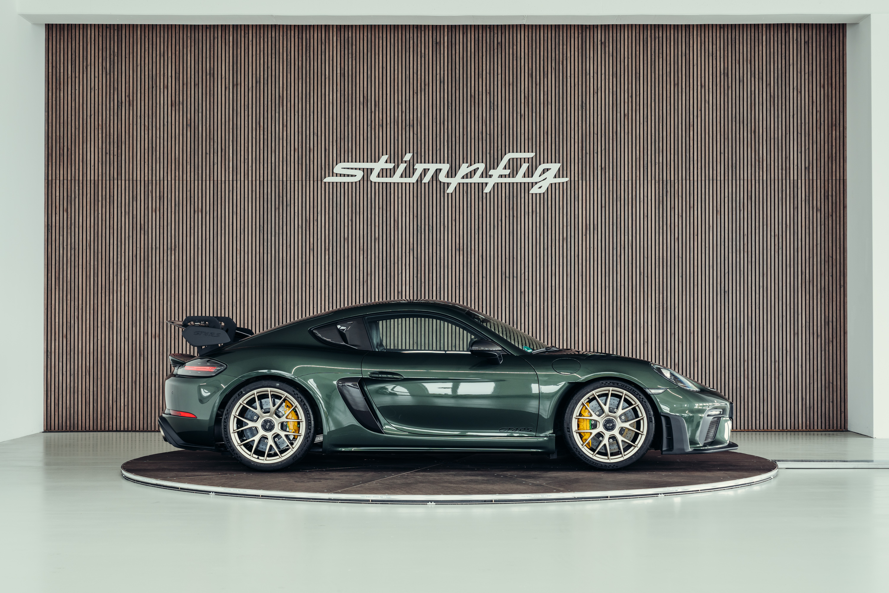 Zum Verkauf steht ein sehr gepflegter Porsche 718 Cayman GT4 RS in der exklusiven PTS-Sonderfarbe „Oakgreenmetallic“.