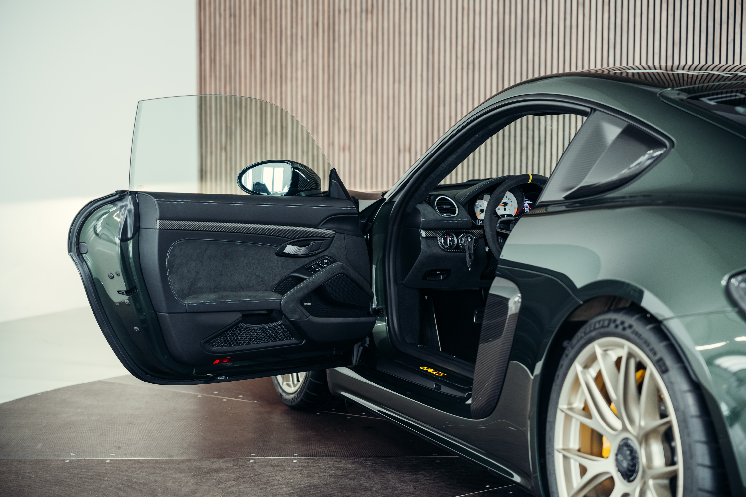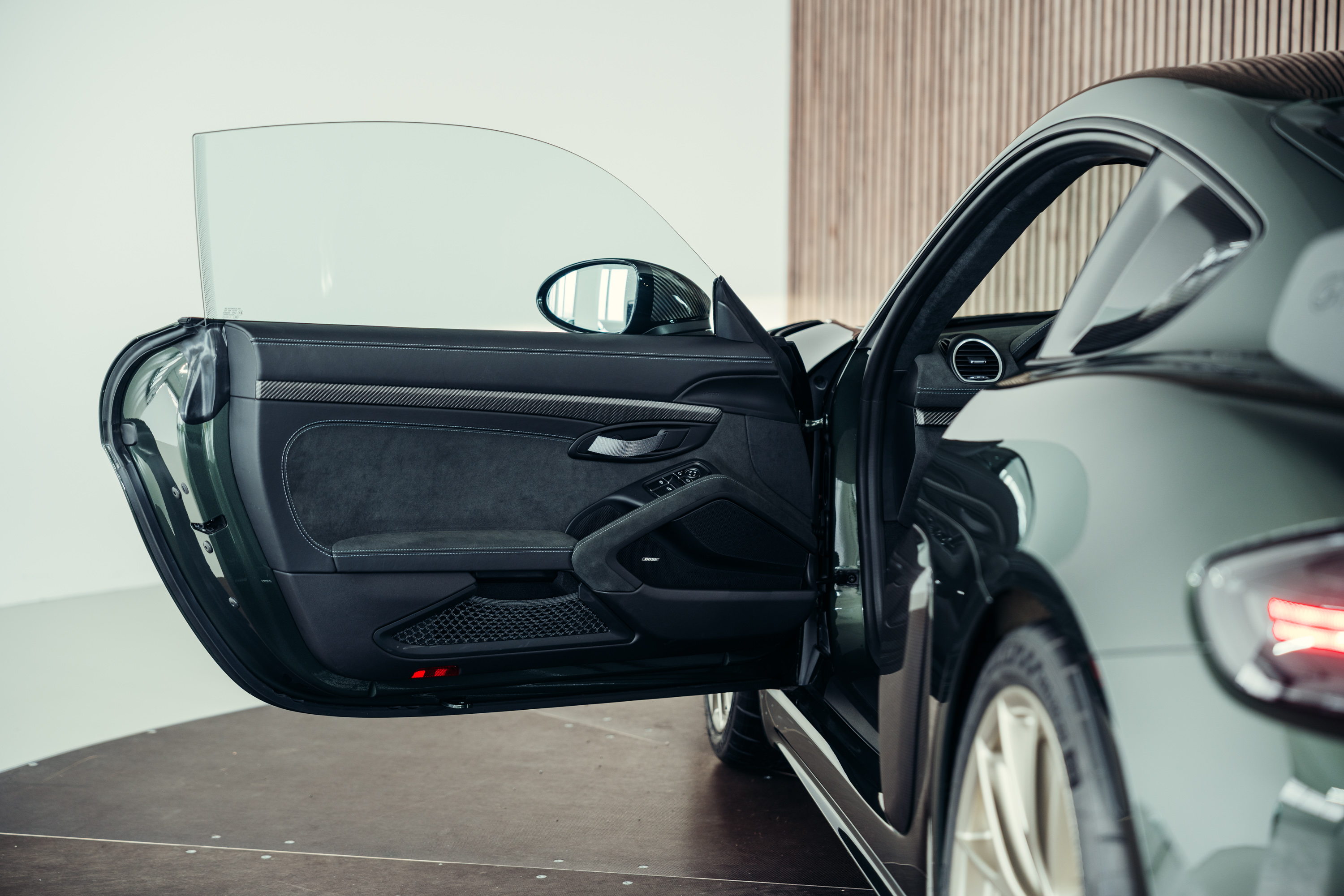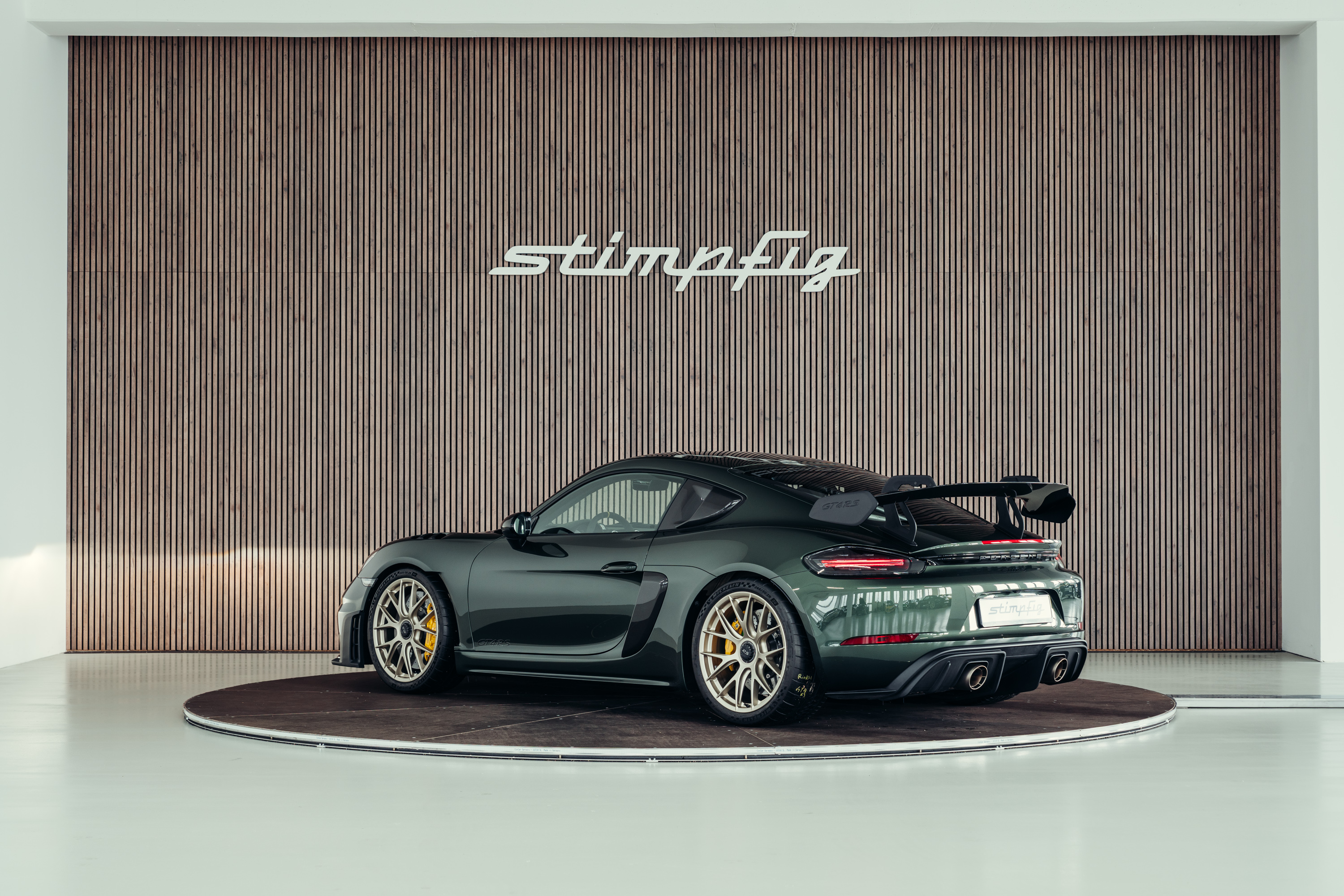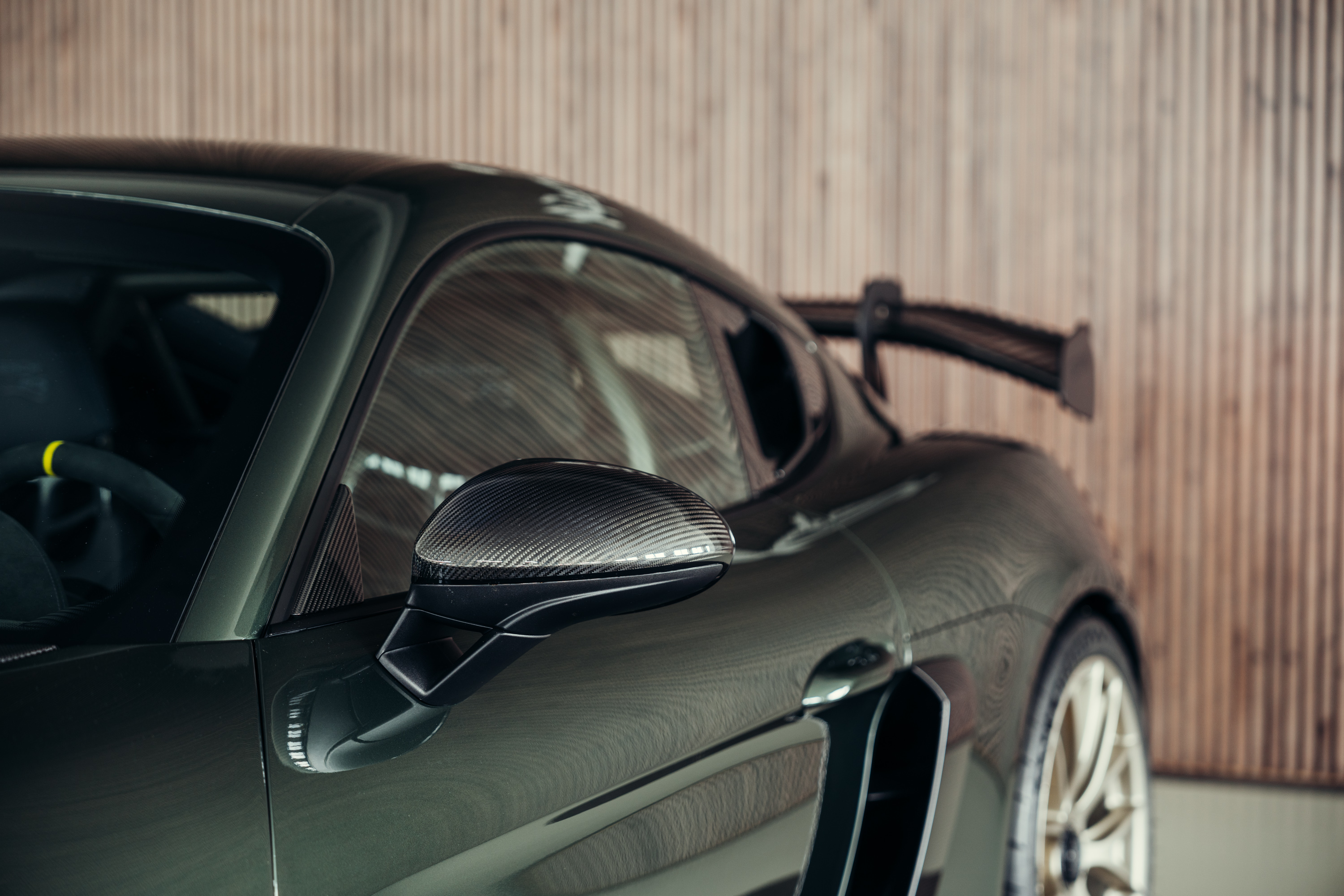 Zum Verkauf steht ein sehr gepflegter Porsche 718 Cayman GT4 RS in der exklusiven PTS-Sonderfarbe „Oakgreenmetallic“.