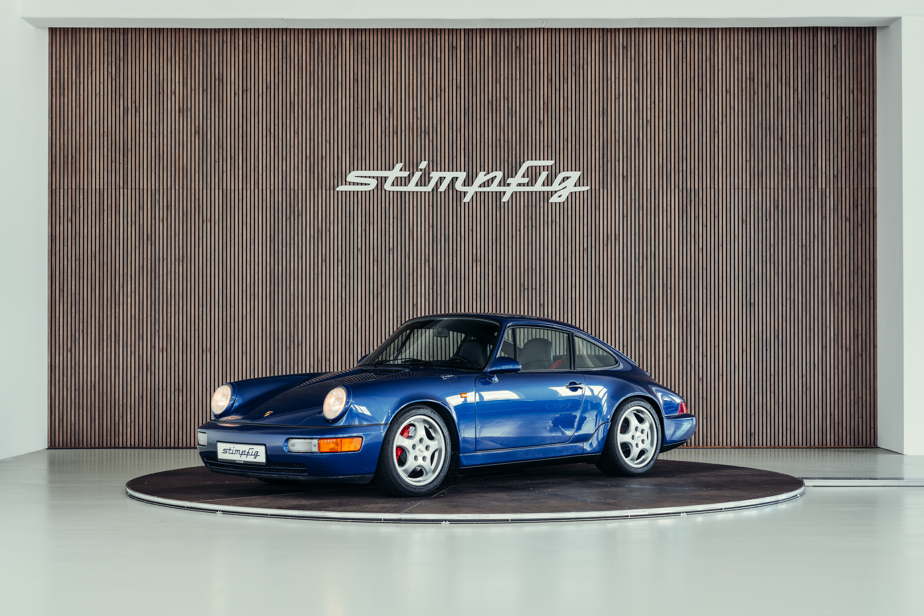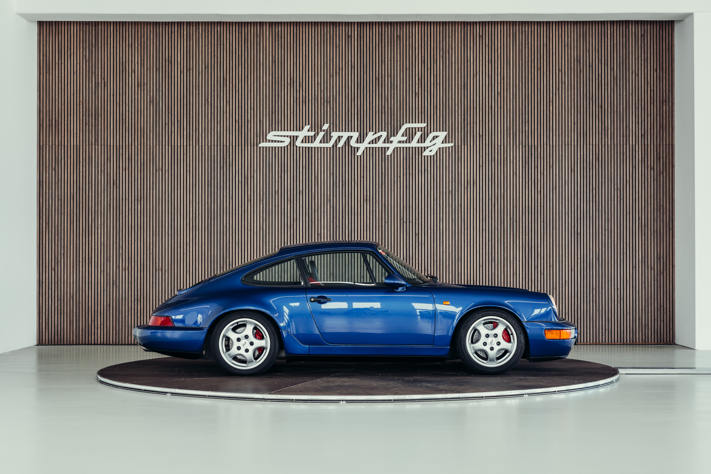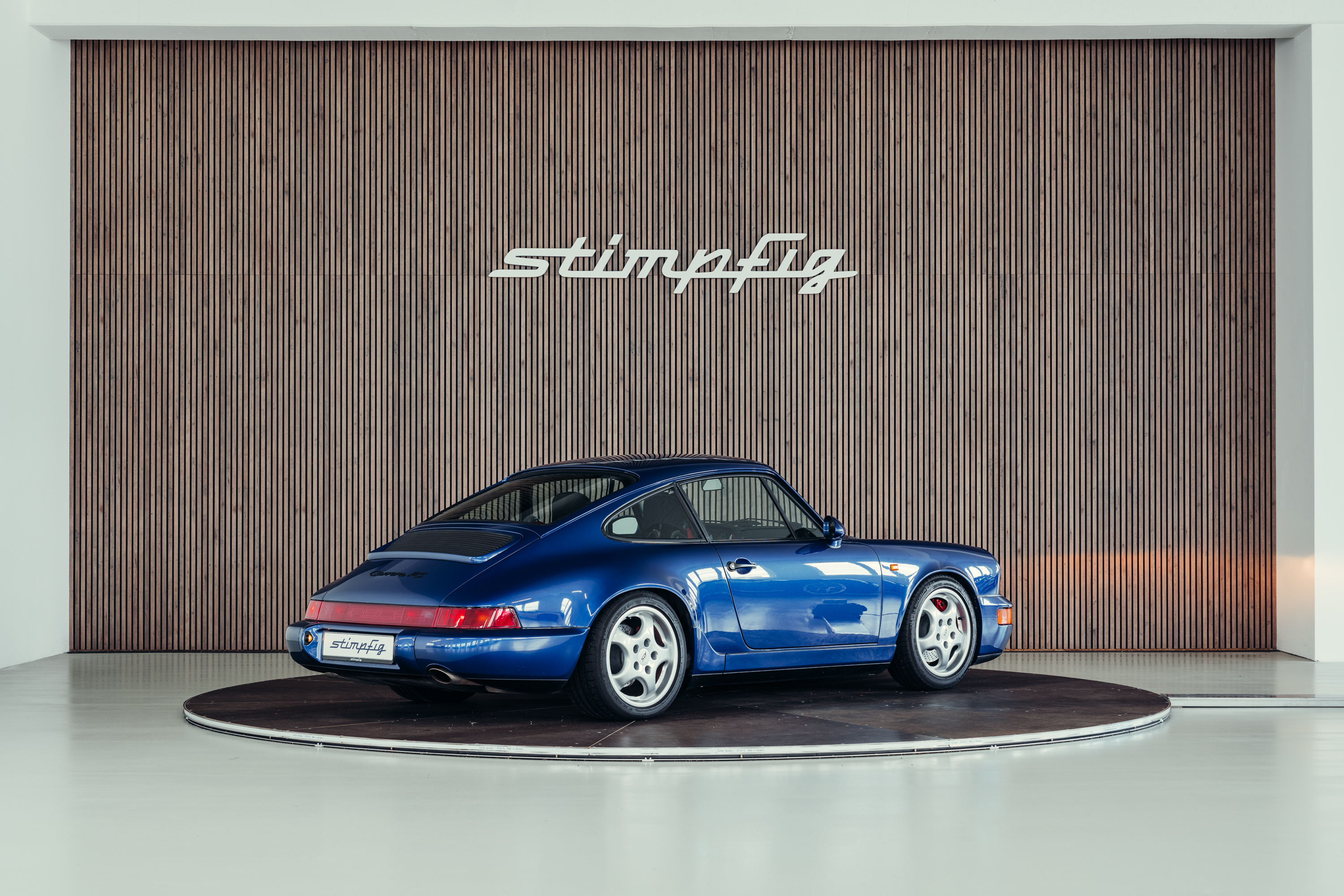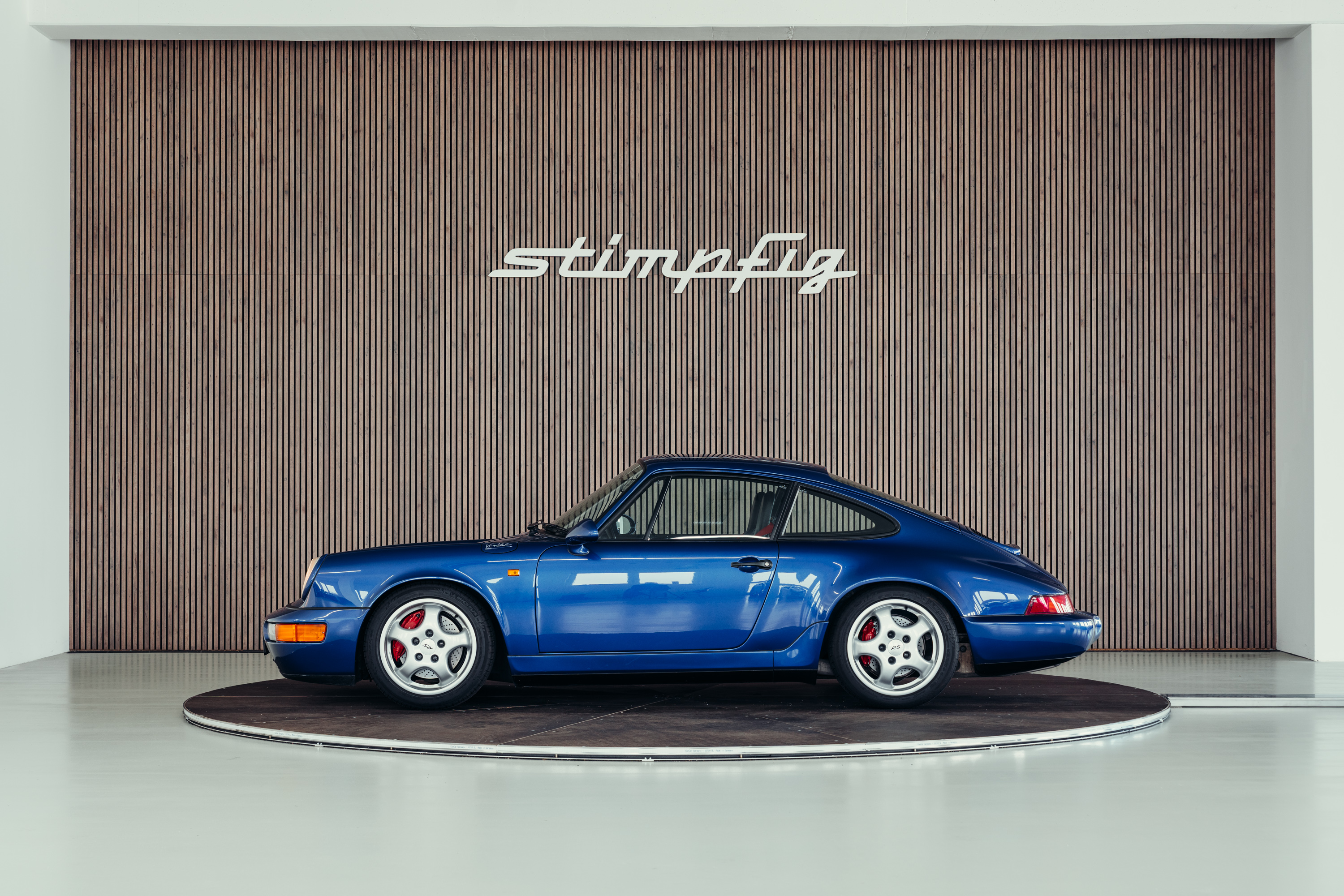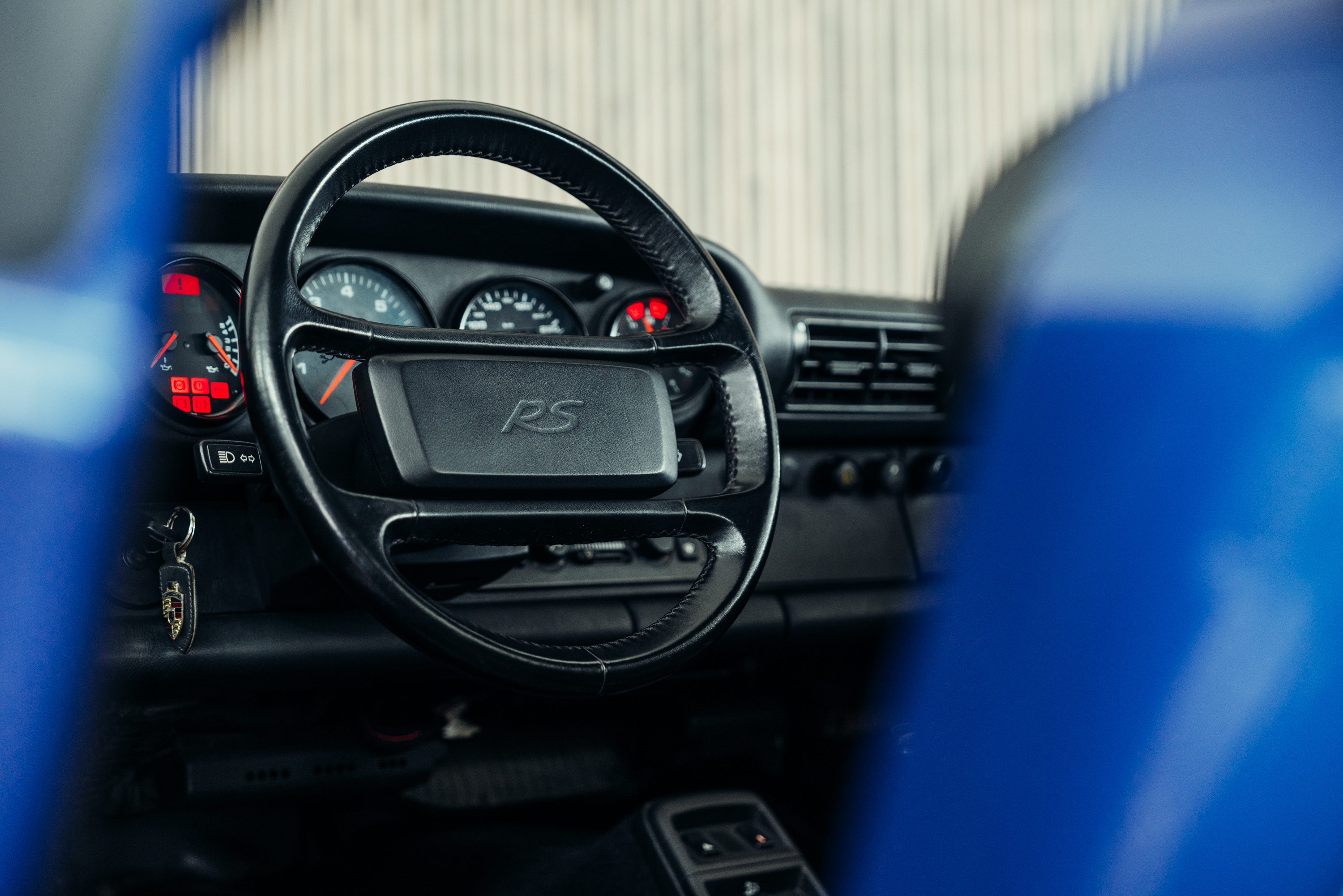 Zum Verkauf steht ein Porsche 964 Carrera RS in der spektakulären Farbe Kobaltblau, die den puristischen Charakter der legendären Carrera RS-Modelle eindrucksvoll verkörpert.