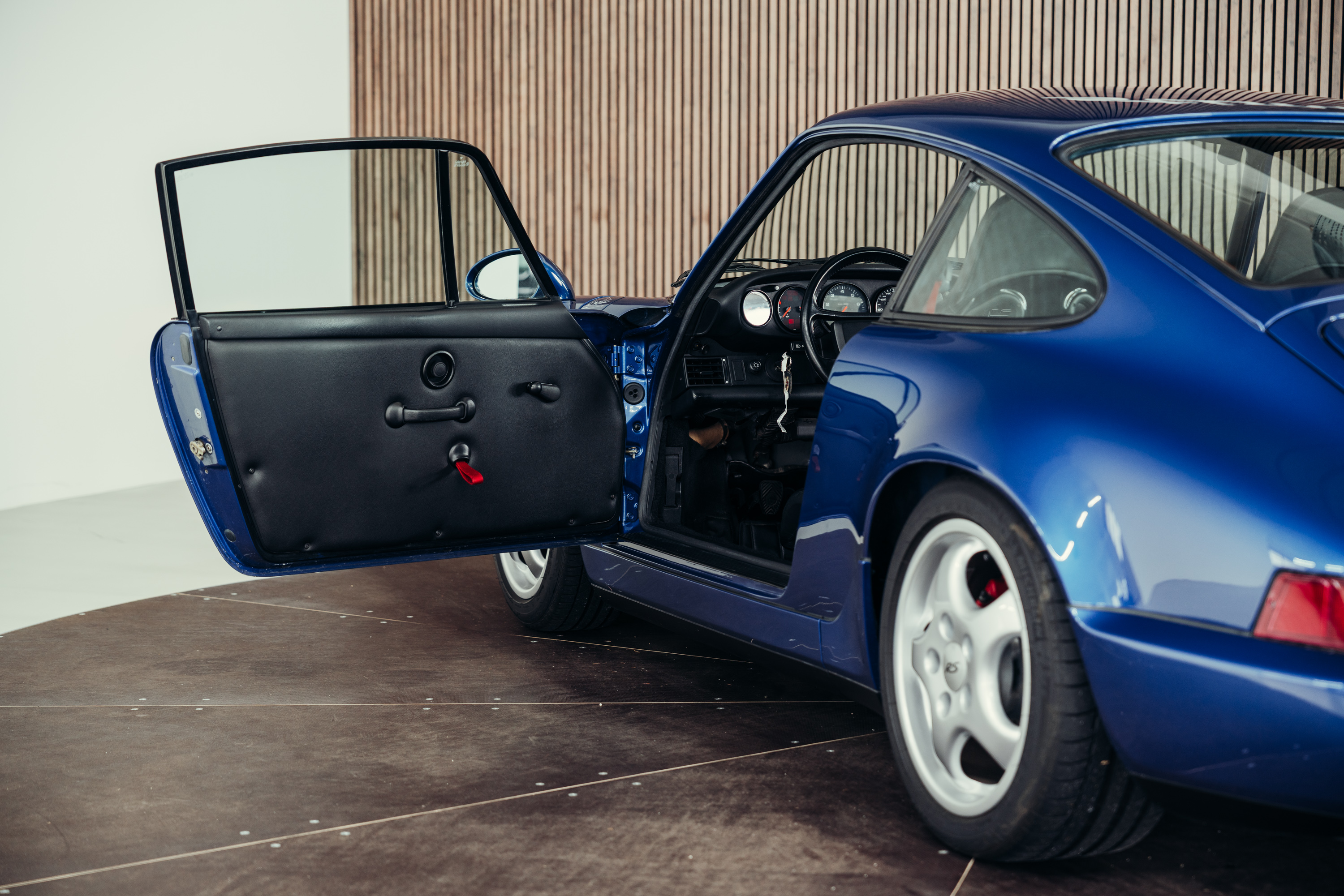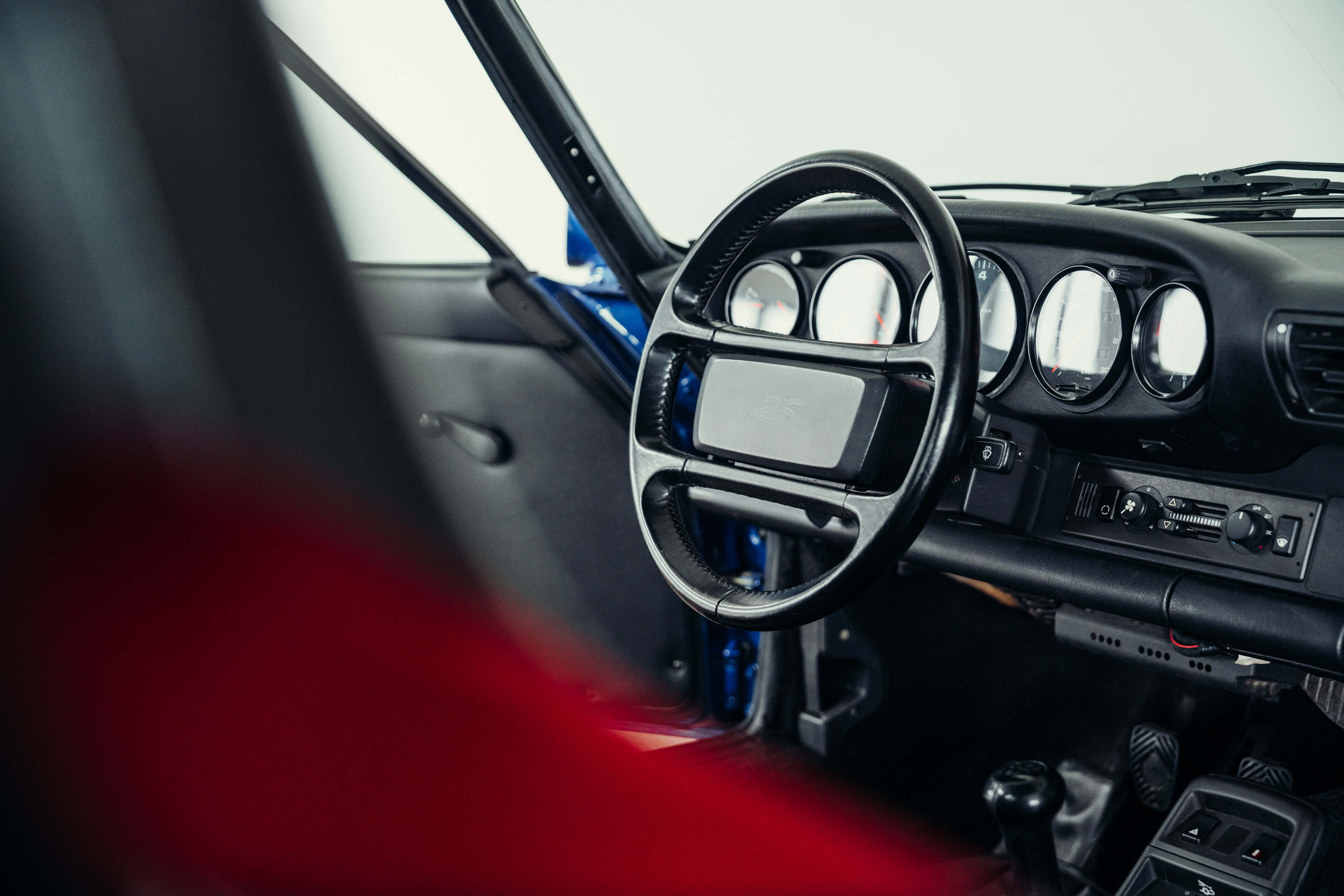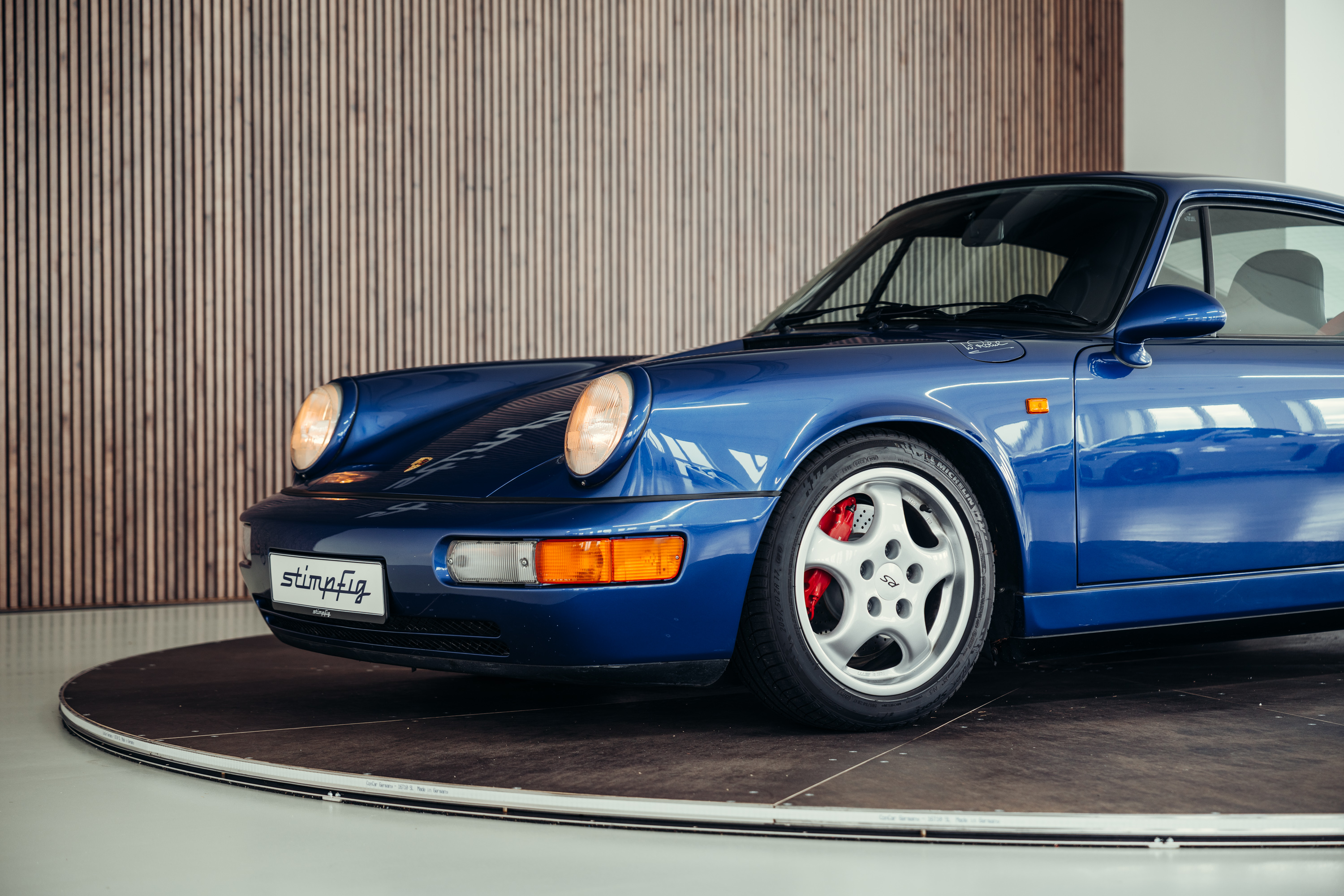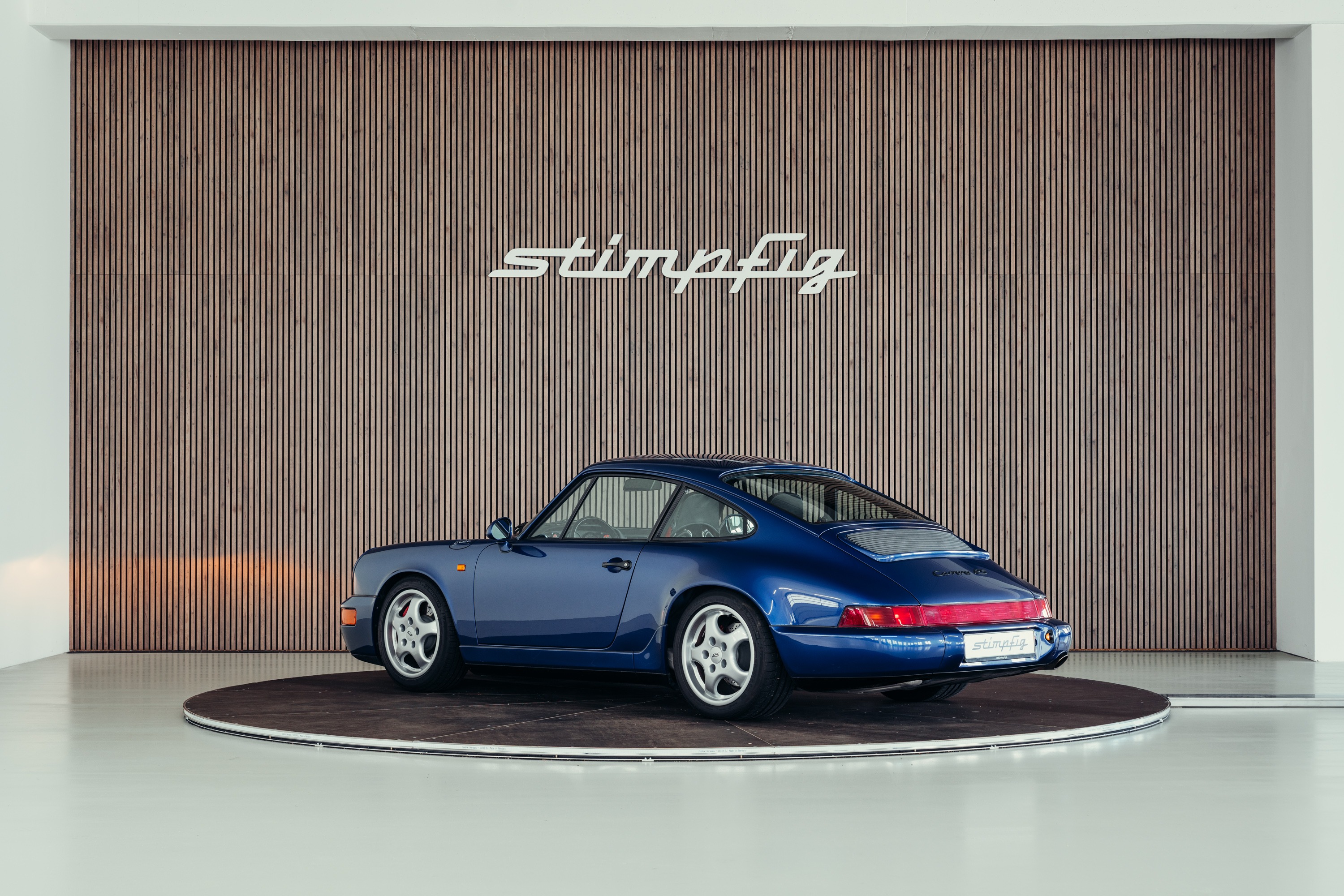 Zum Verkauf steht ein Porsche 964 Carrera RS in der spektakulären Farbe Kobaltblau, die den puristischen Charakter der legendären Carrera RS-Modelle eindrucksvoll verkörpert.