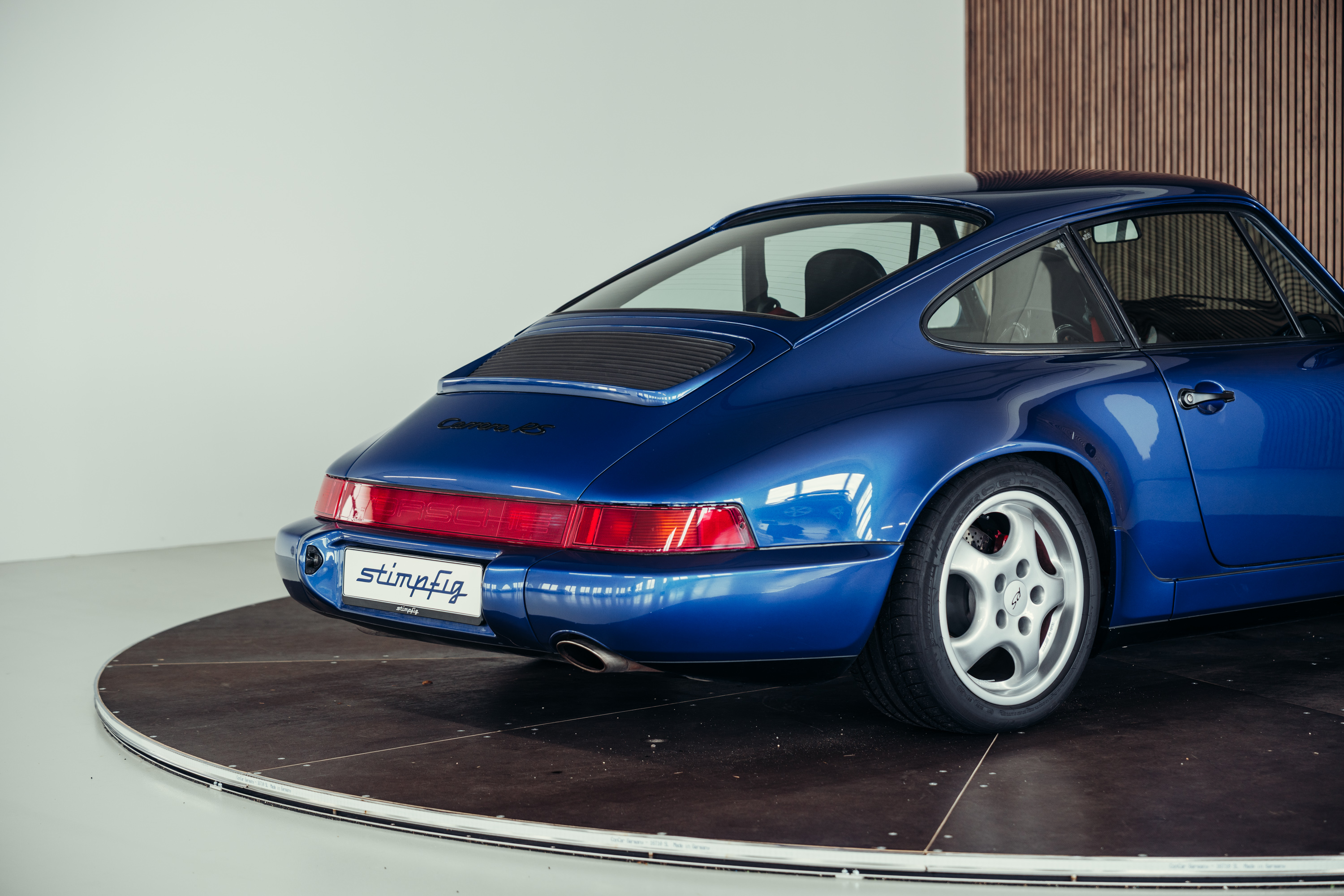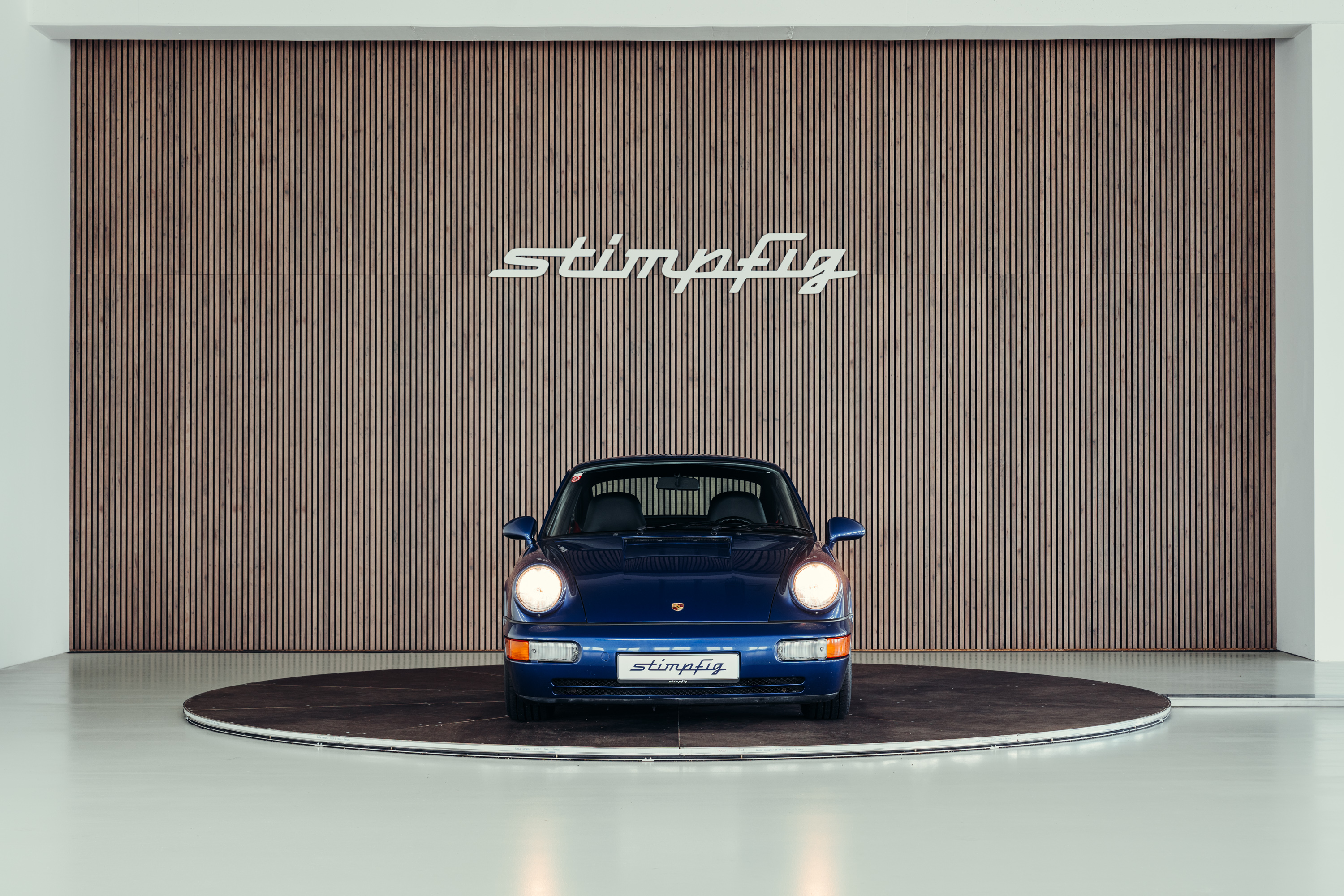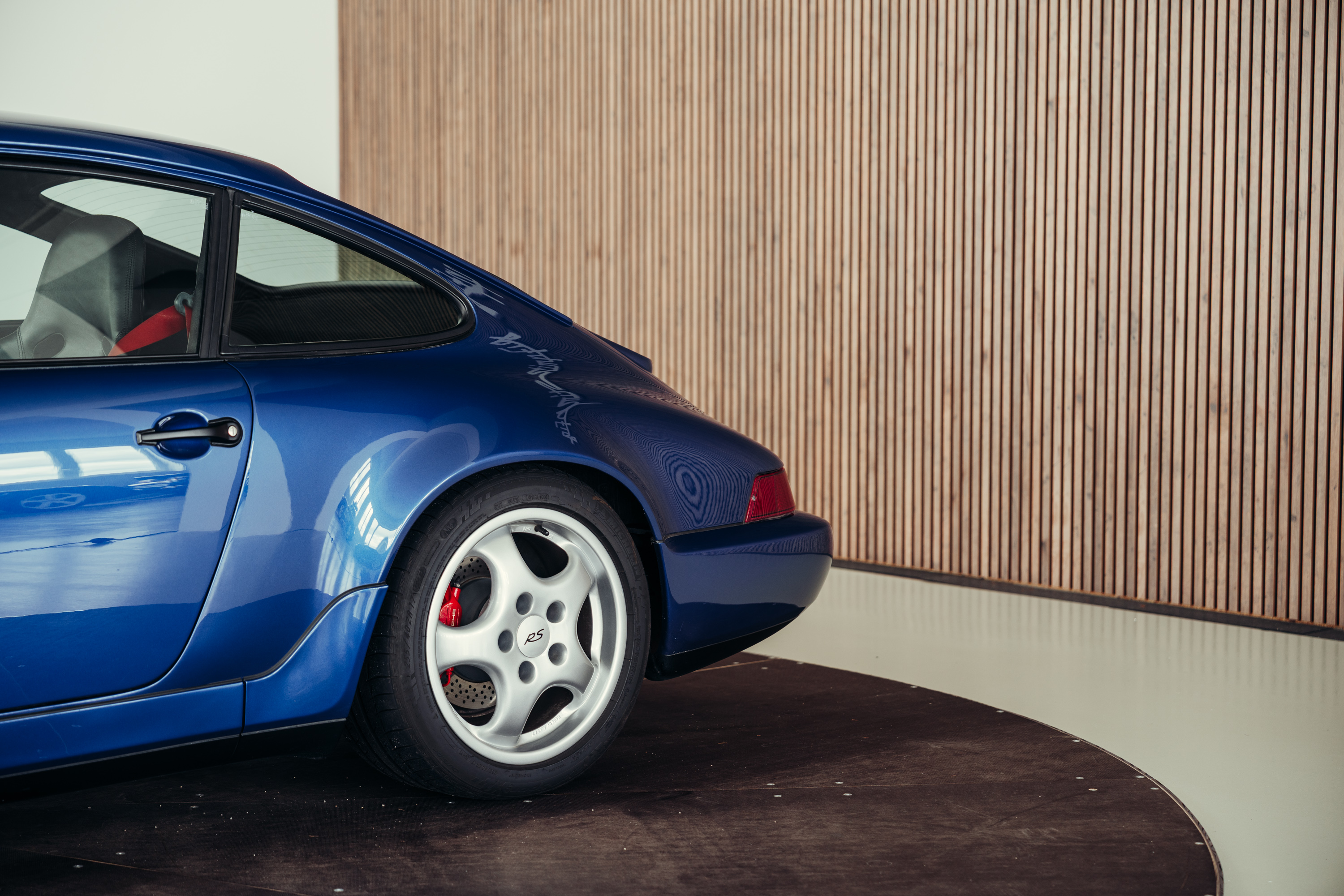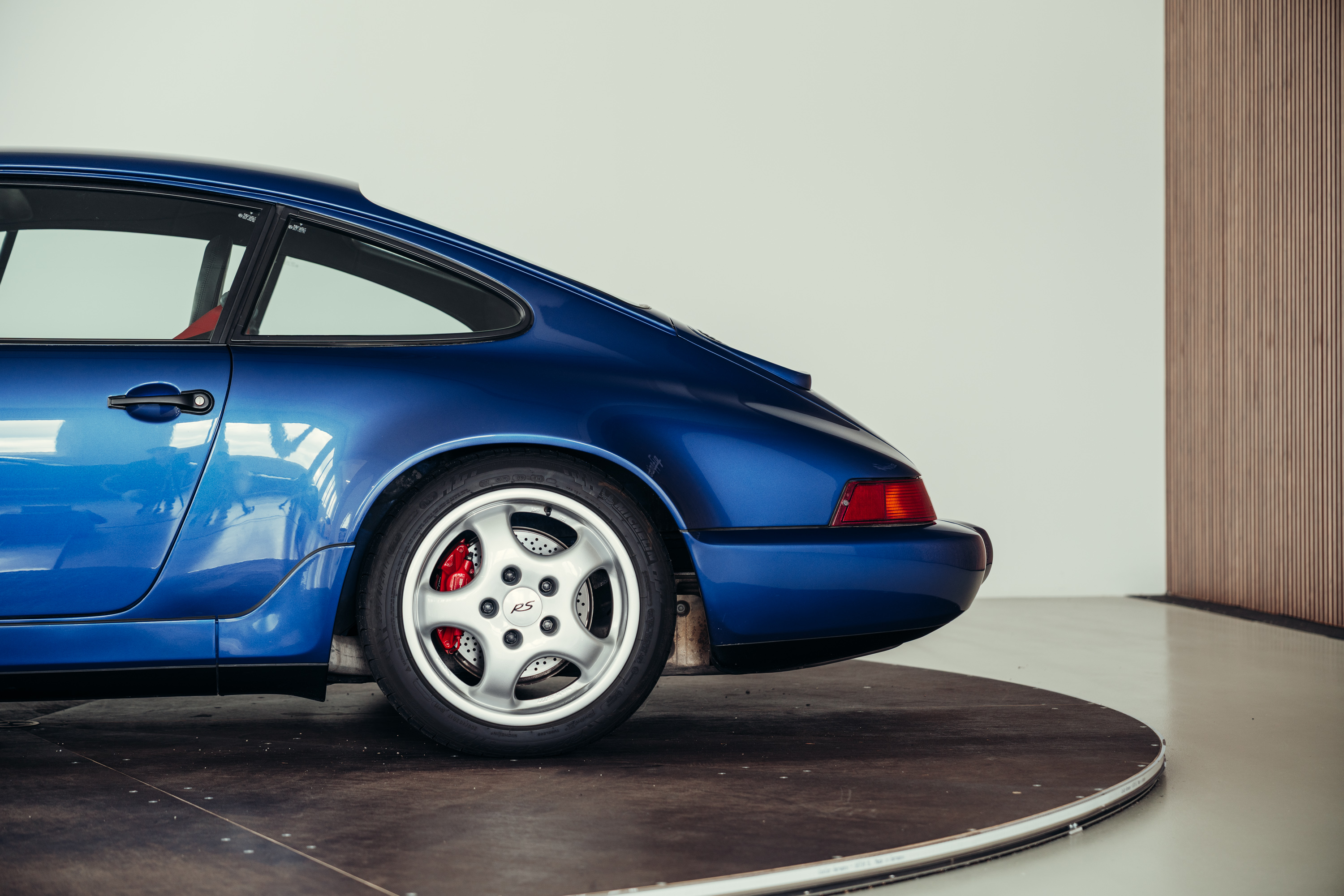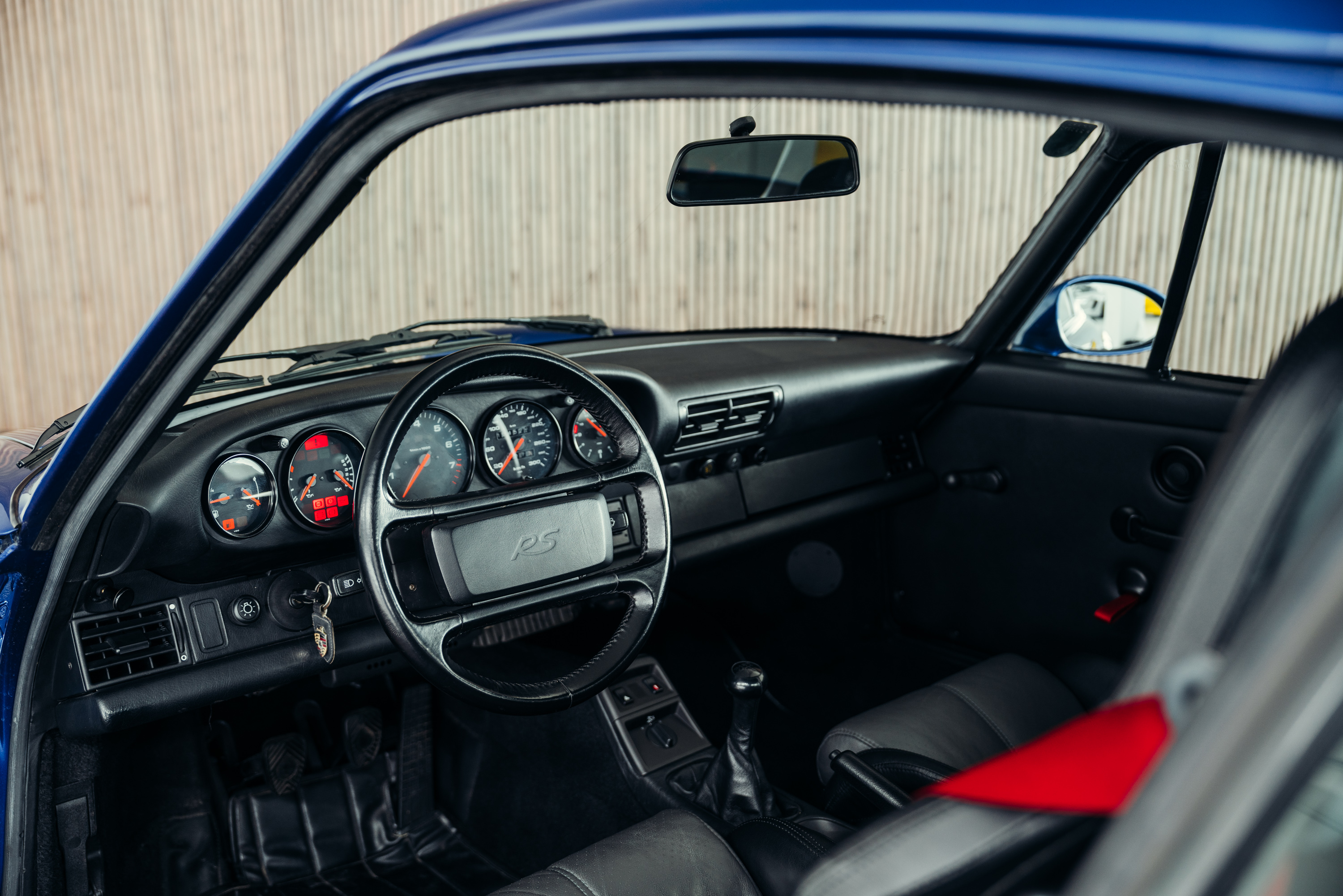 Zum Verkauf steht ein Porsche 964 Carrera RS in der spektakulären Farbe Kobaltblau, die den puristischen Charakter der legendären Carrera RS-Modelle eindrucksvoll verkörpert.