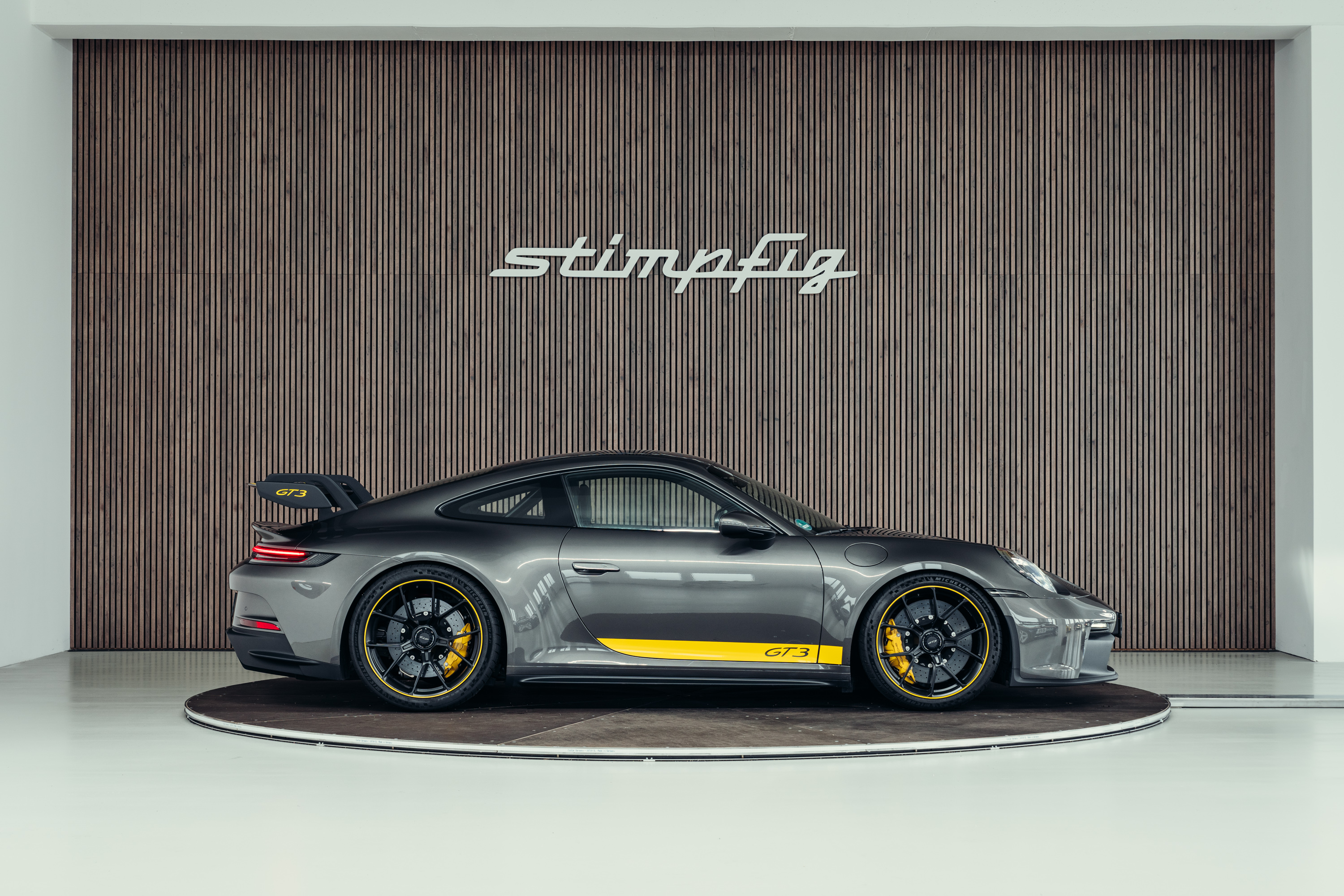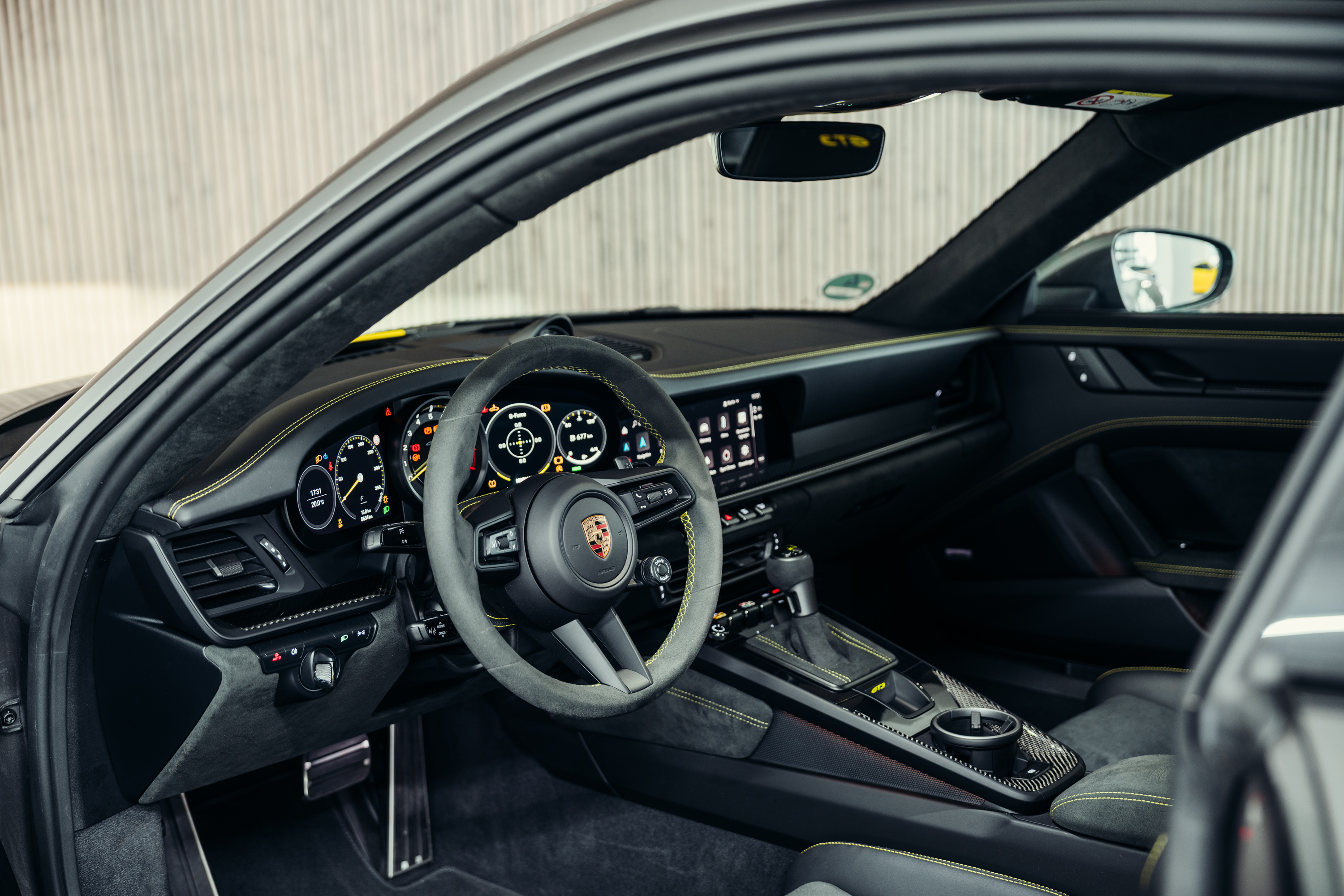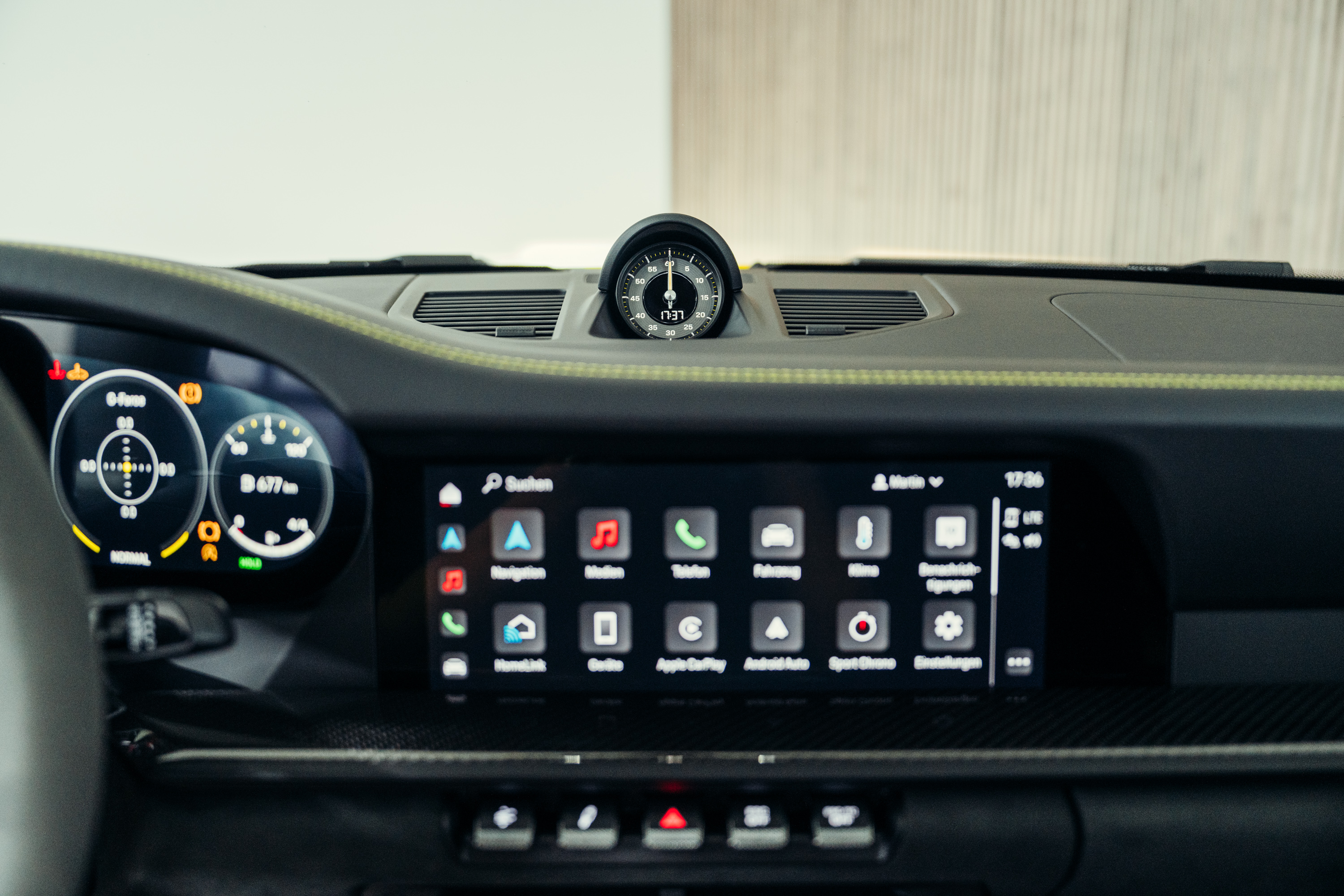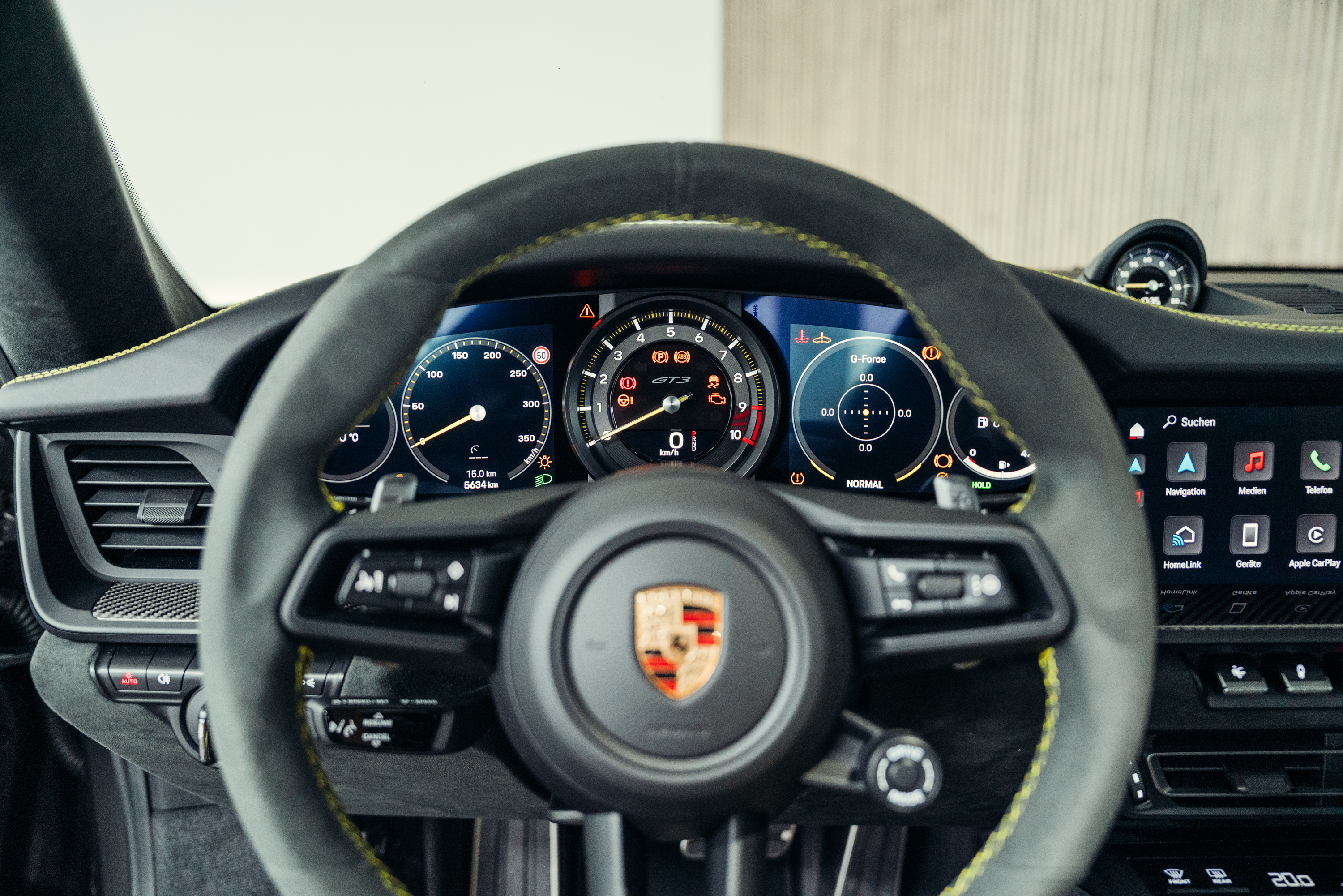 Es verfügt über eine umfangreiche und hochwertige Sonderausstattung, darunter Porsche Ceramic Composite Brake (PCCB), Frontlift-System sowie zahlreiche Carbon-Details im Interieur, die das sportliche Design noch stärker unterstreichen und den exklusiven Charakter dieses GT3 betonen.