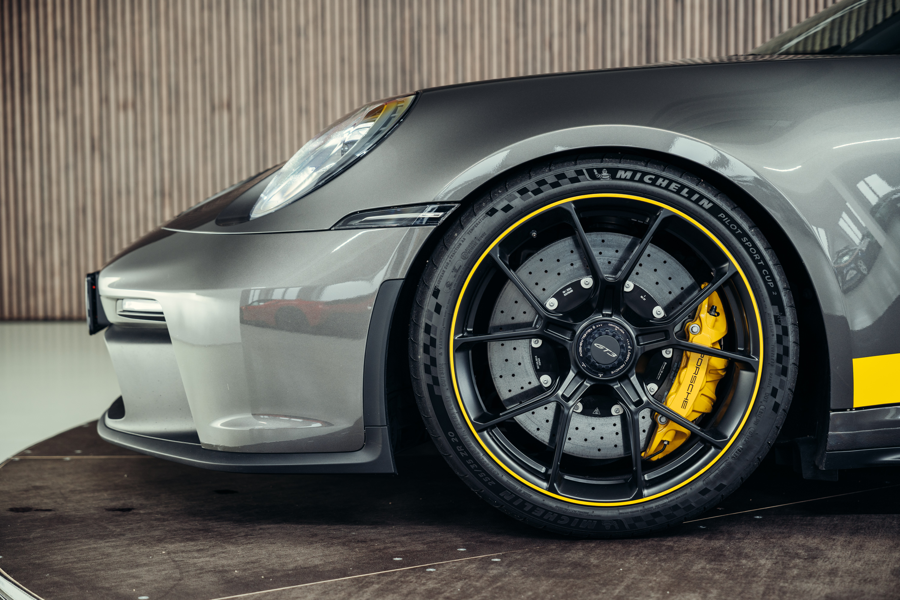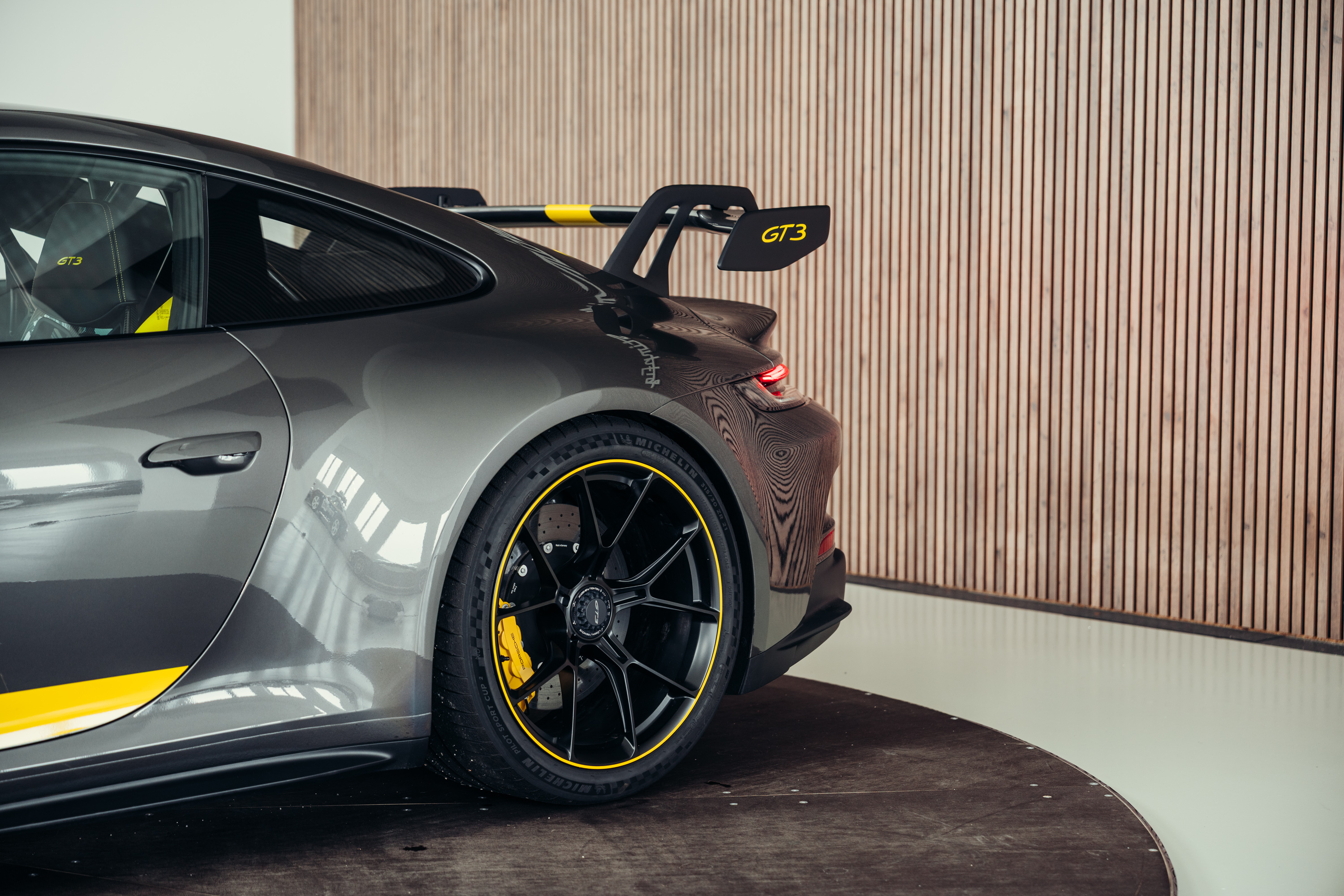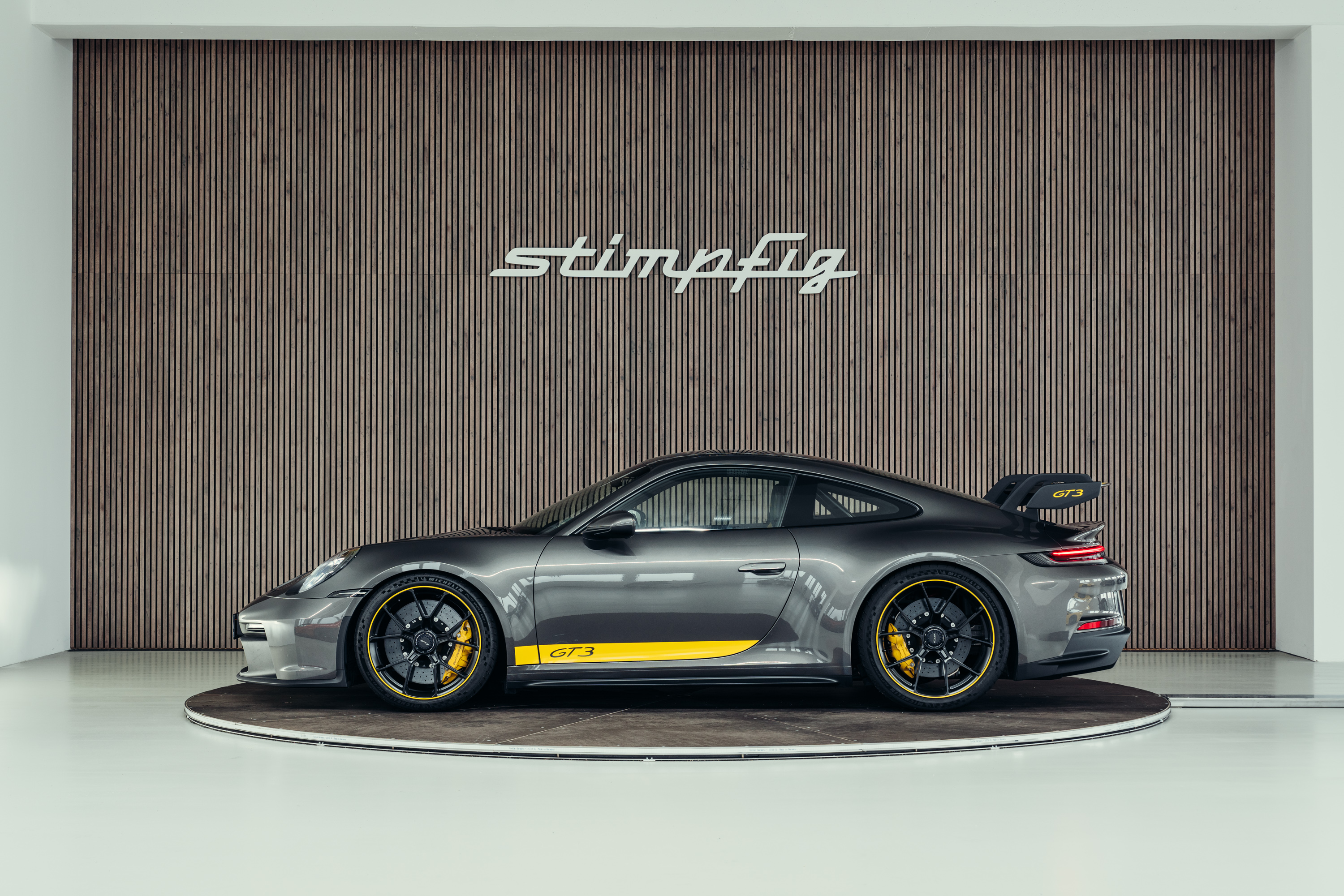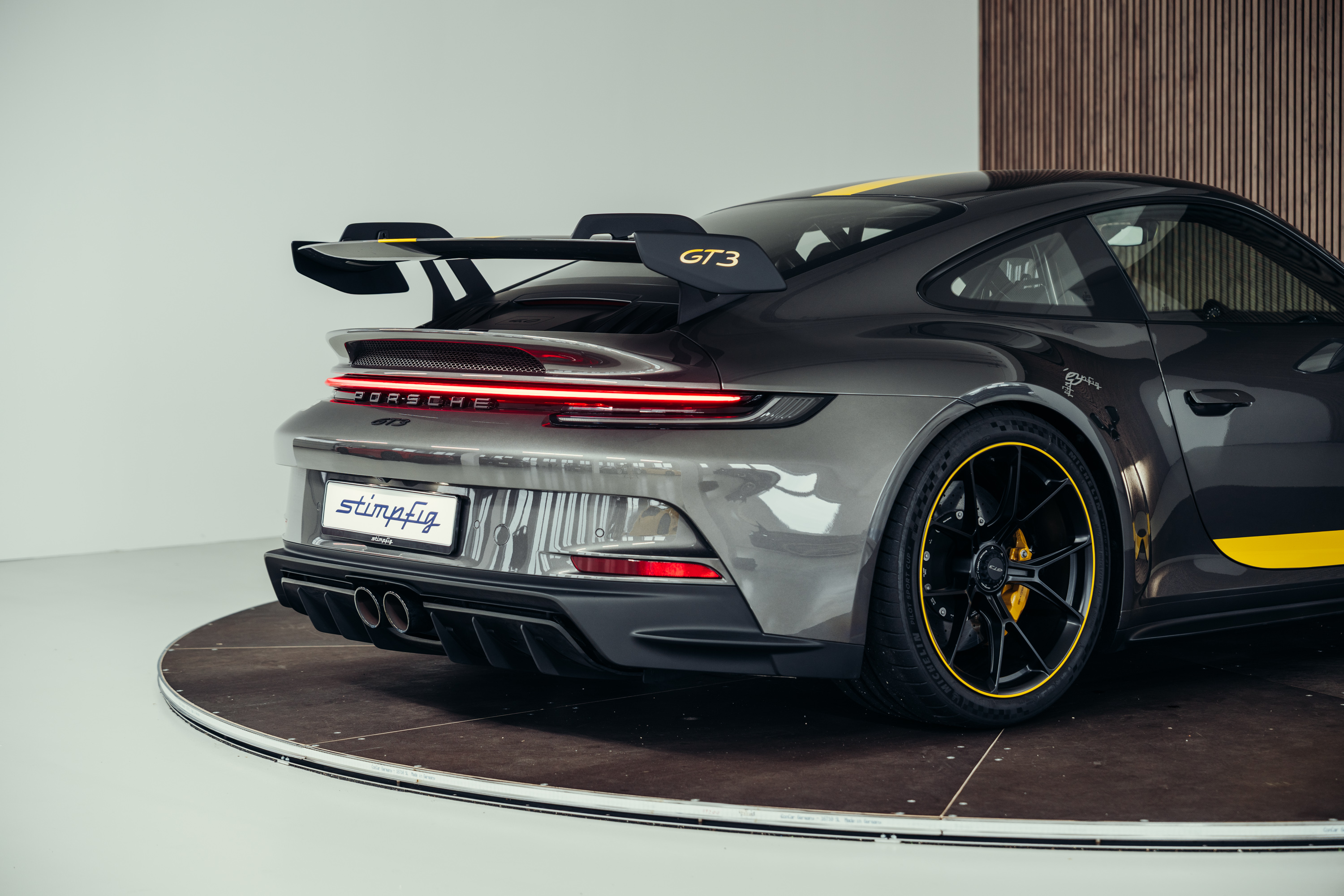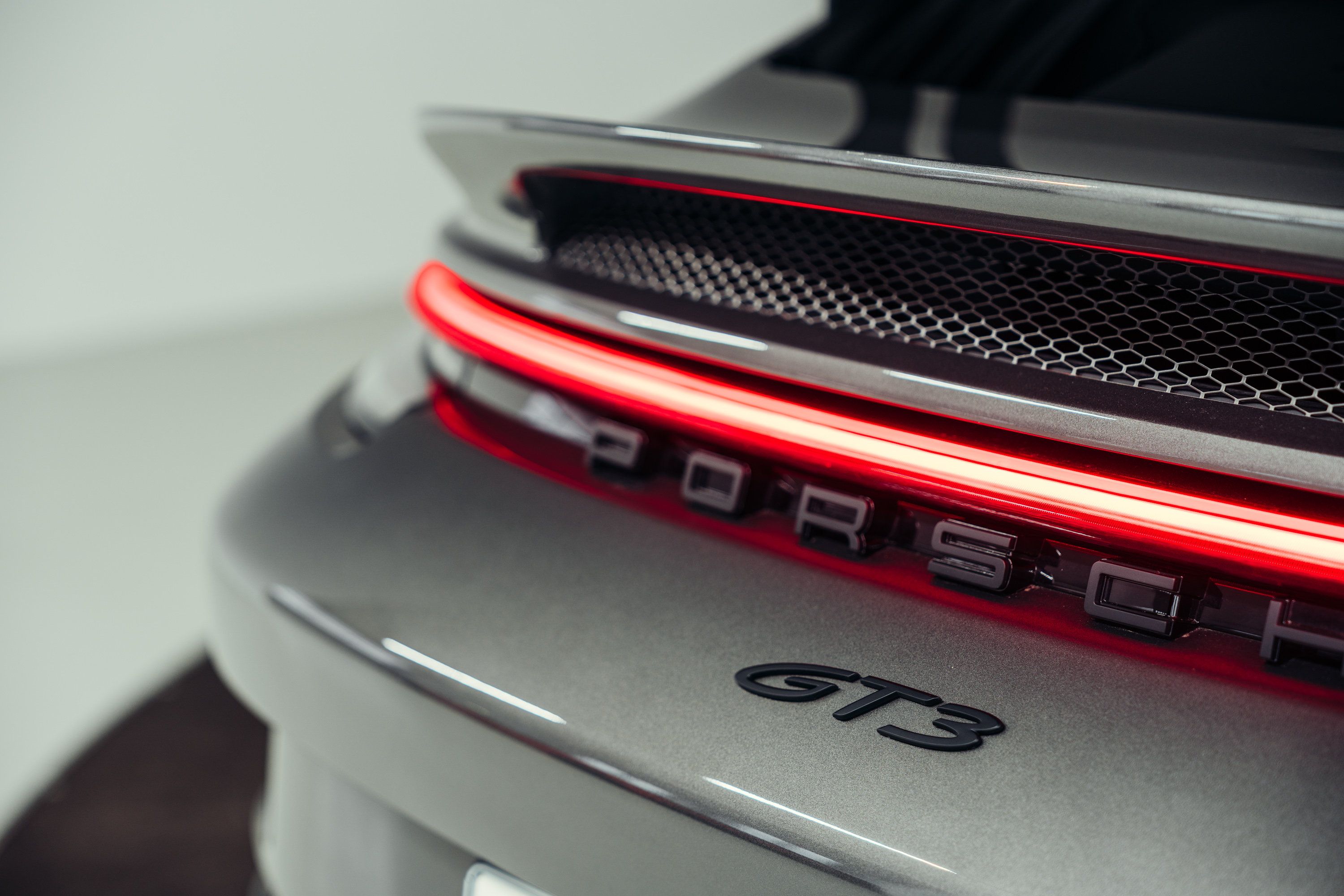 Es verfügt über eine umfangreiche und hochwertige Sonderausstattung, darunter Porsche Ceramic Composite Brake (PCCB), Frontlift-System sowie zahlreiche Carbon-Details im Interieur, die das sportliche Design noch stärker unterstreichen und den exklusiven Charakter dieses GT3 betonen.