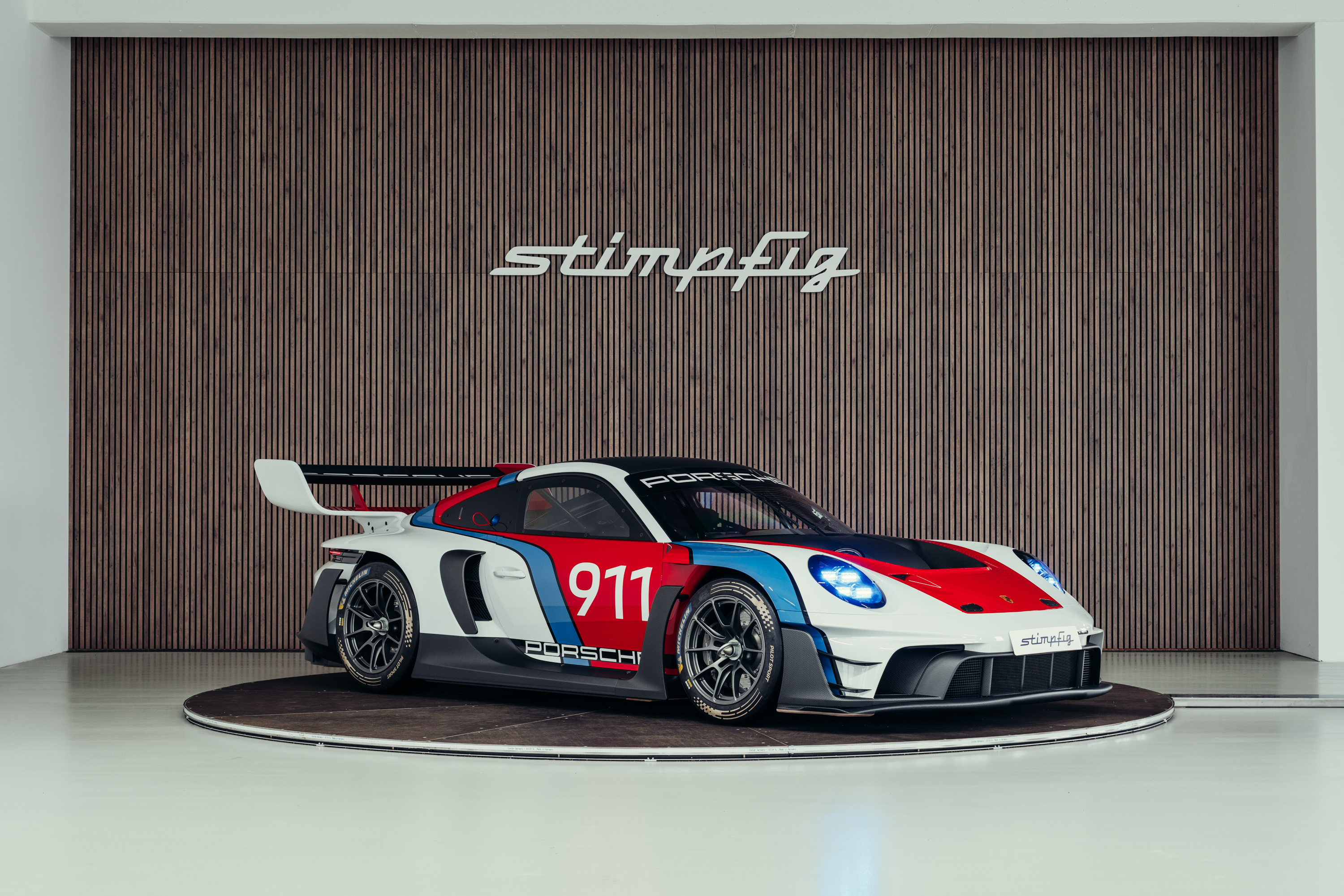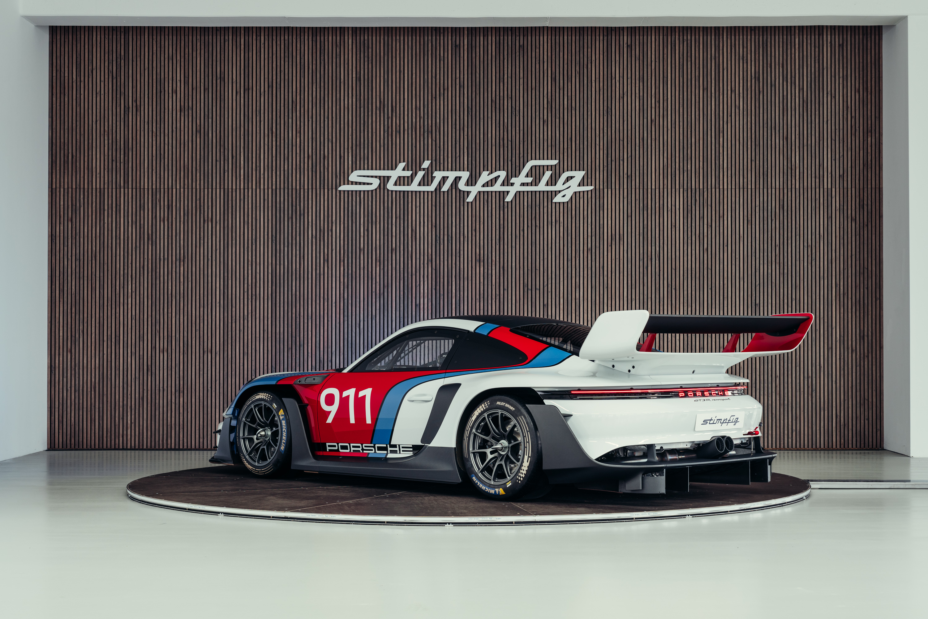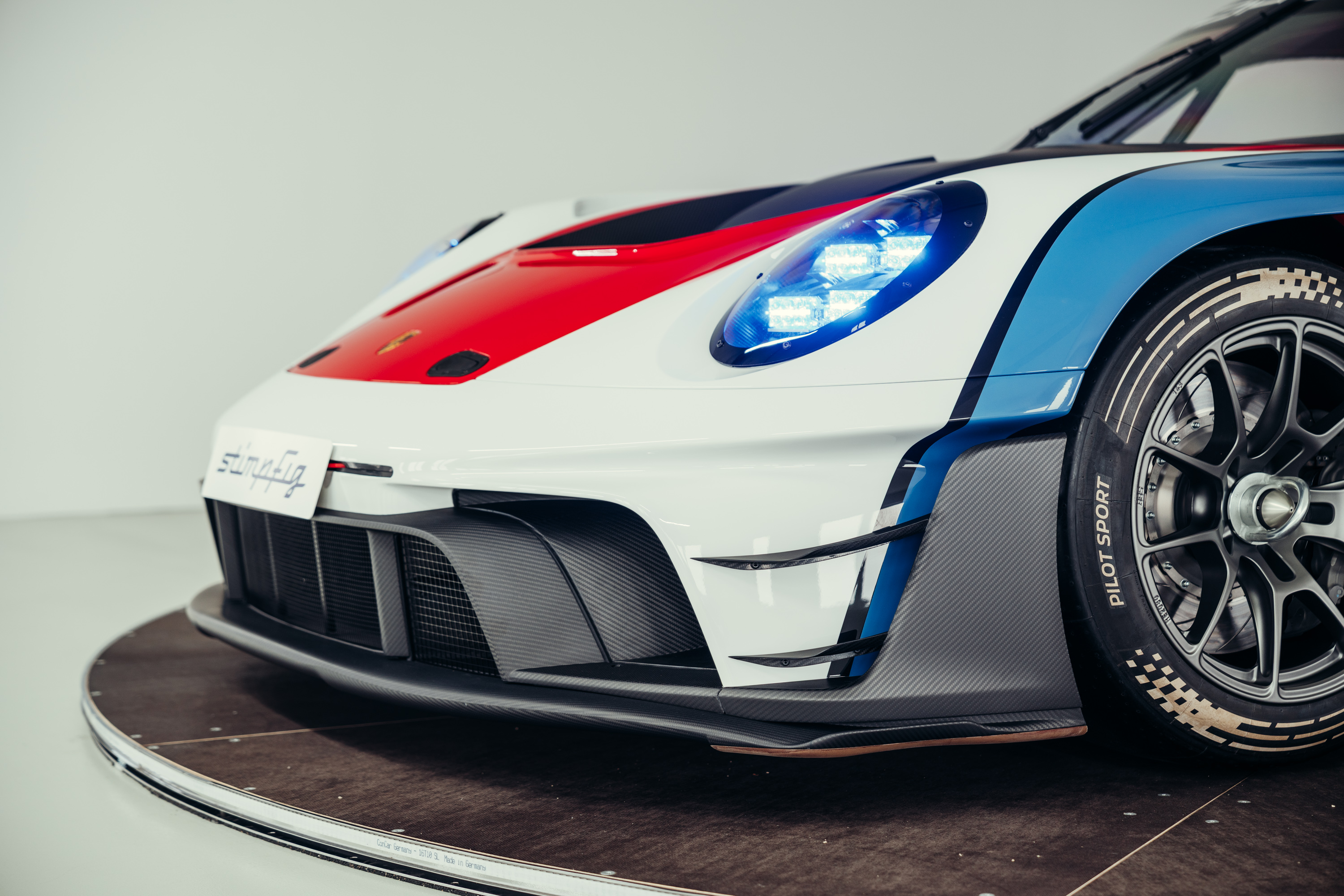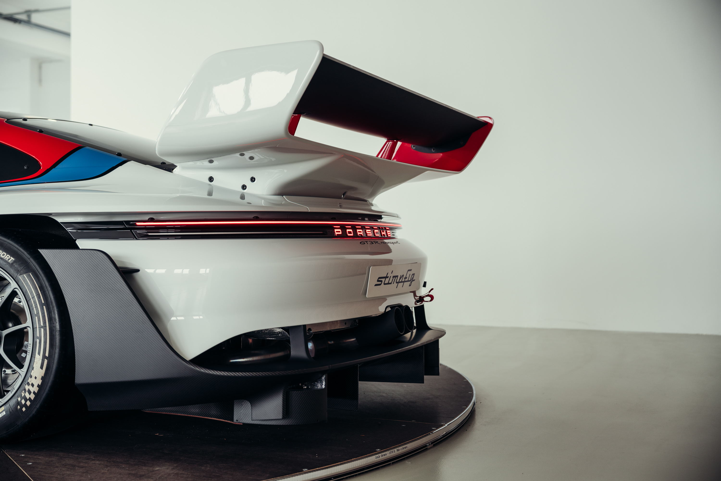 The vehicle is based on the Porsche 911 GT3 R (992 generation) and was developed uncompromisingly as a pure race car. Power comes from a high-revving 4.2-liter naturally aspirated flat-six engine producing up to approximately 620 hp, paired with a sequential racing gearbox. The chassis, aerodynamics, and braking system reflect the very latest GT3 racing standards and are fully optimized for track use. The striking white, blue, and red Rennsport Reunion livery is entirely hand-painted rather than wrapped. This elaborate multi-layer paint finish highlights the exclusive character of this special model and deliberately references Porsche’s iconic motorsport heritage.