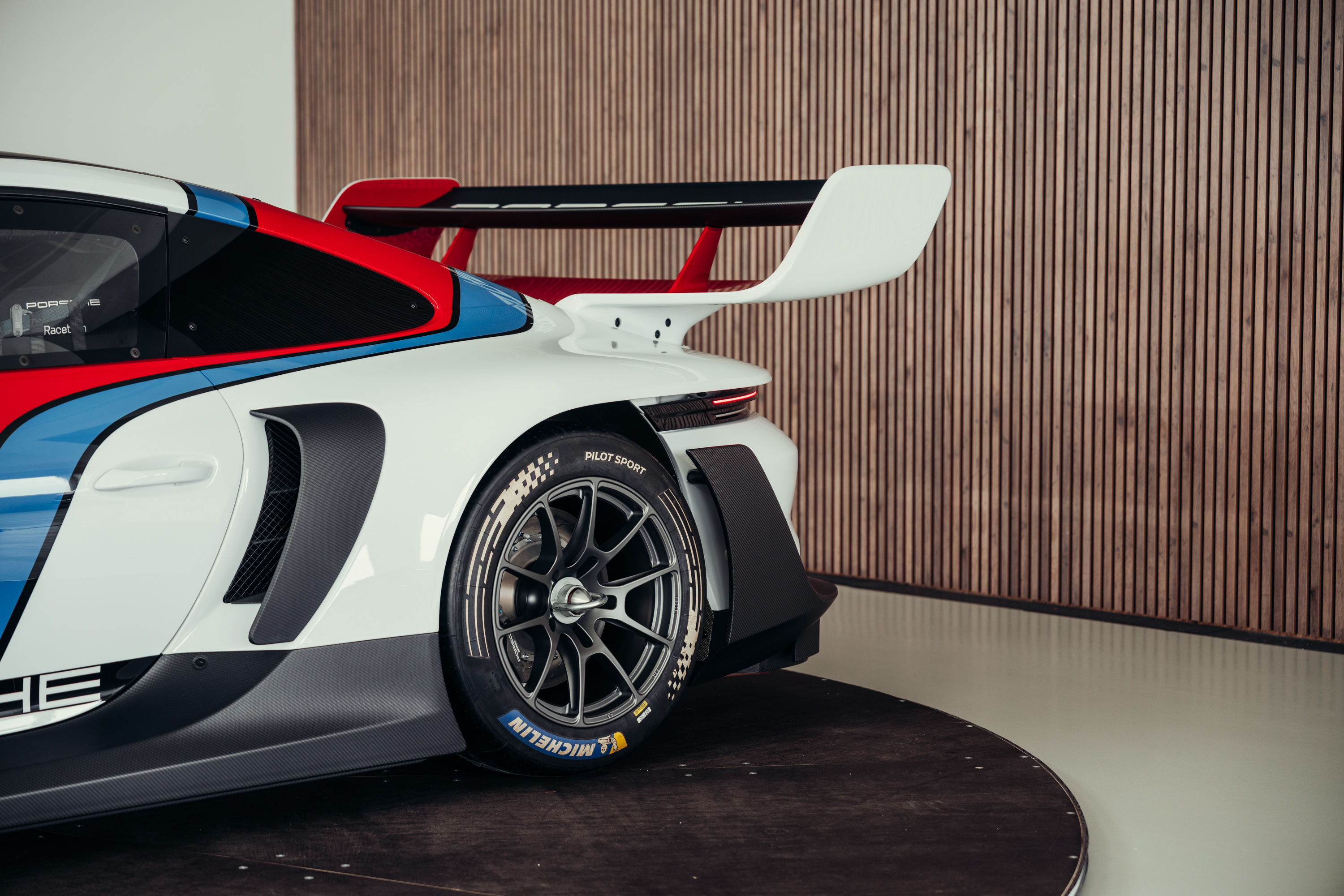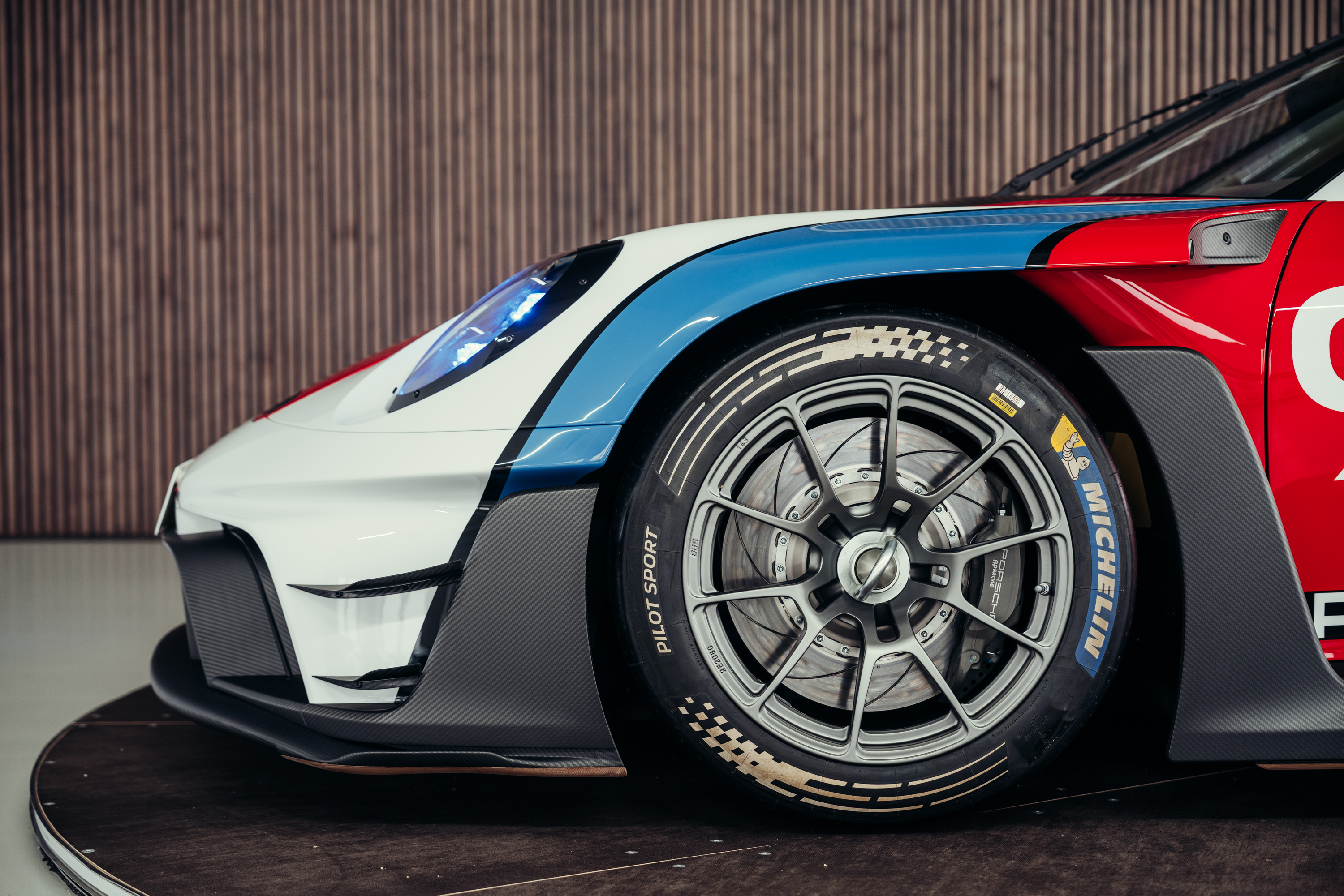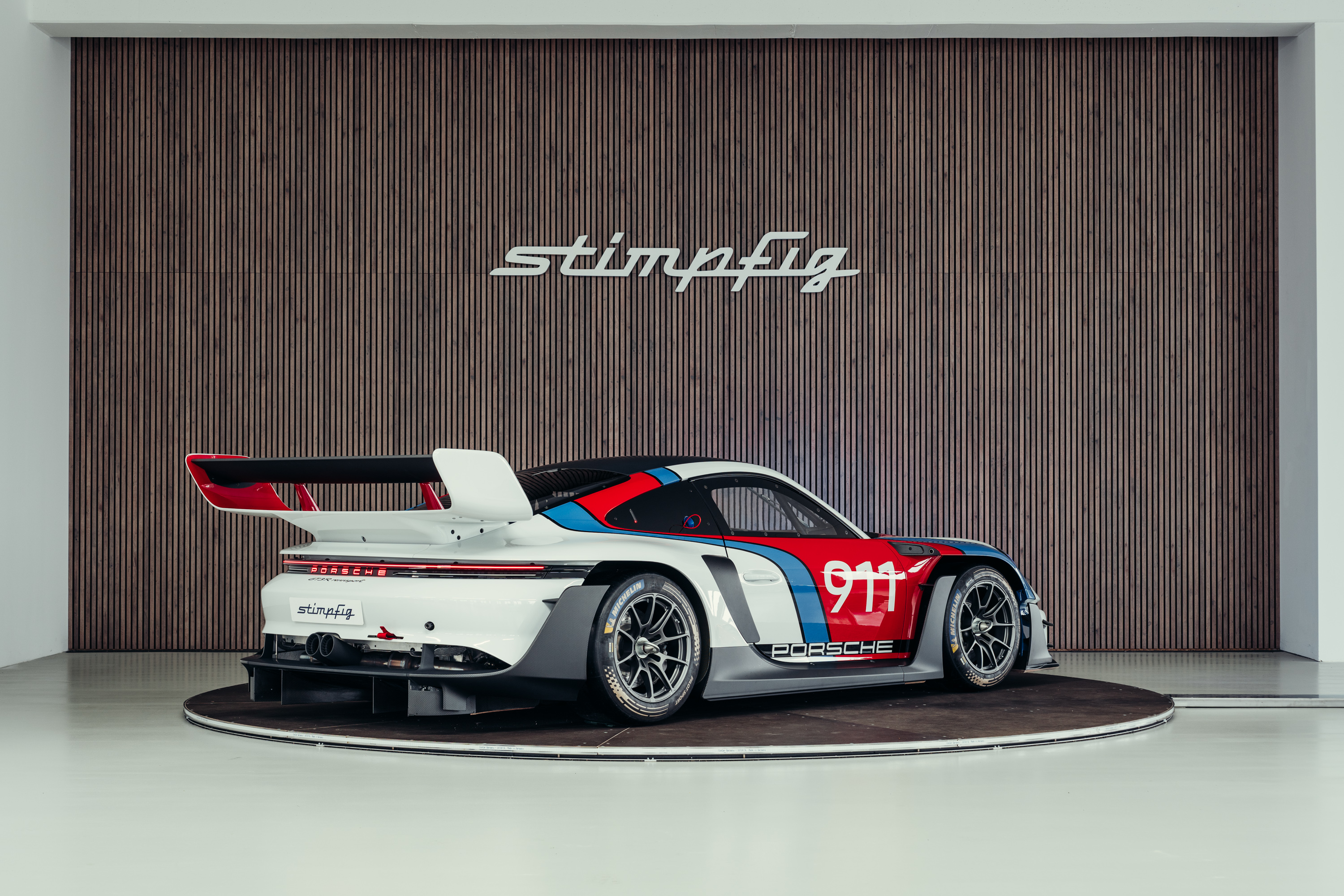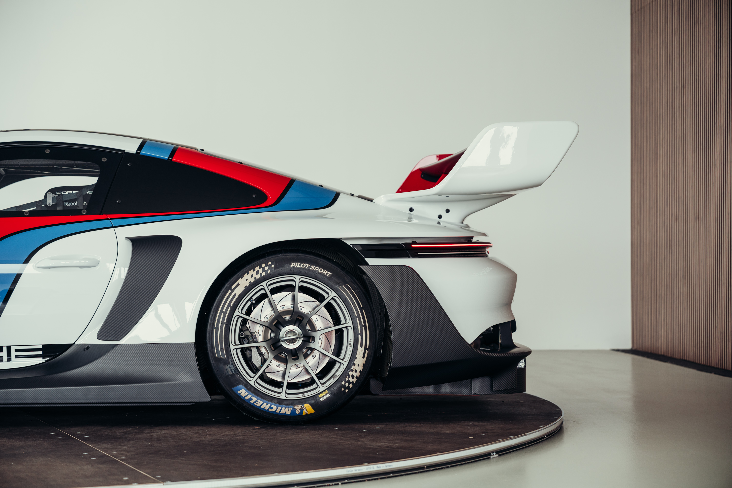 The vehicle is based on the Porsche 911 GT3 R (992 generation) and was developed uncompromisingly as a pure race car. Power comes from a high-revving 4.2-liter naturally aspirated flat-six engine producing up to approximately 620 hp, paired with a sequential racing gearbox. The chassis, aerodynamics, and braking system reflect the very latest GT3 racing standards and are fully optimized for track use. The striking white, blue, and red Rennsport Reunion livery is entirely hand-painted rather than wrapped. This elaborate multi-layer paint finish highlights the exclusive character of this special model and deliberately references Porsche’s iconic motorsport heritage.