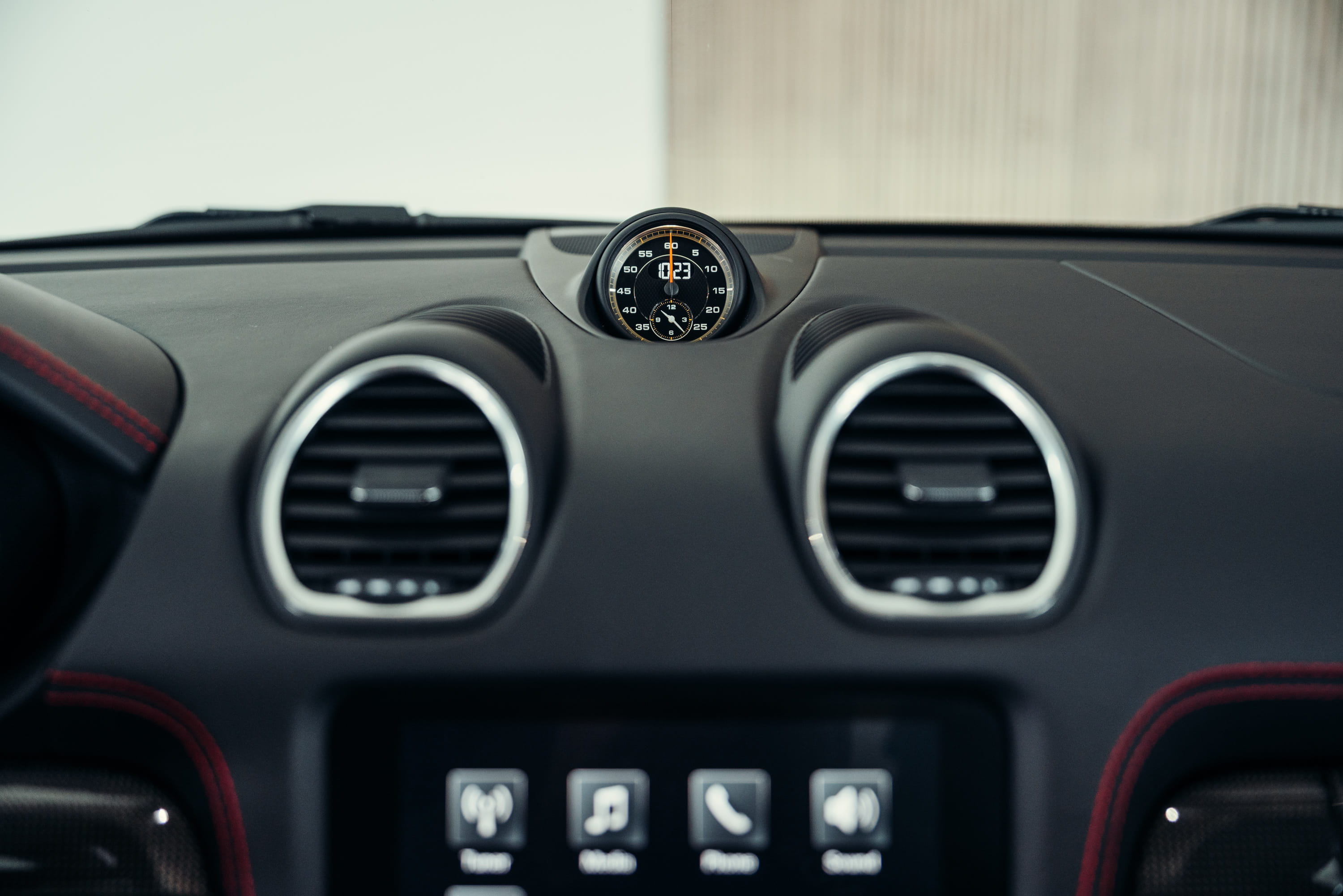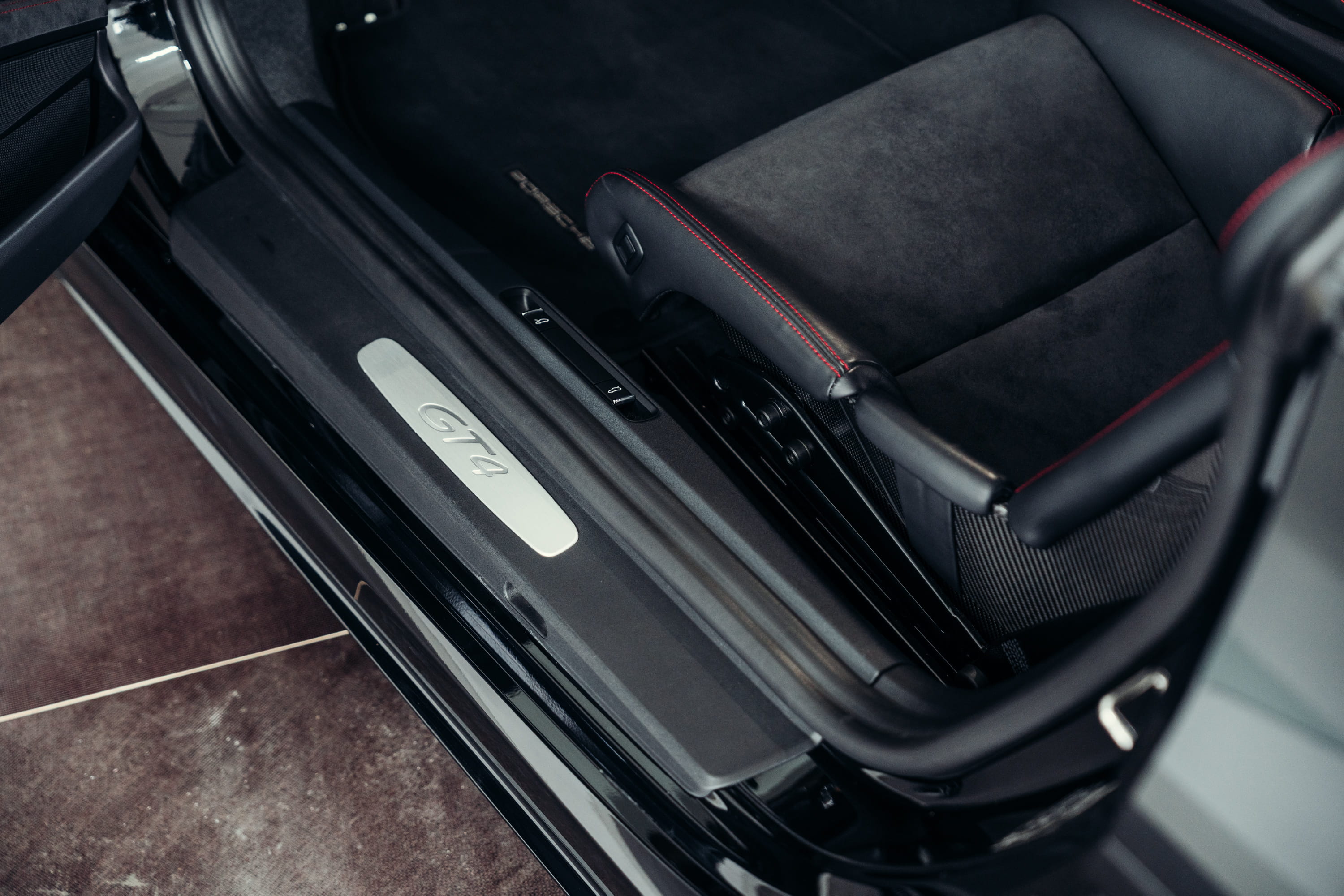 The interior features a black leather upholstery that stylishly emphasizes the vehicle’s sporty character while creating a high-quality and exclusive atmosphere. The clean, driver-focused cockpit layout perfectly completes the overall impression of this uncompromising sports car.