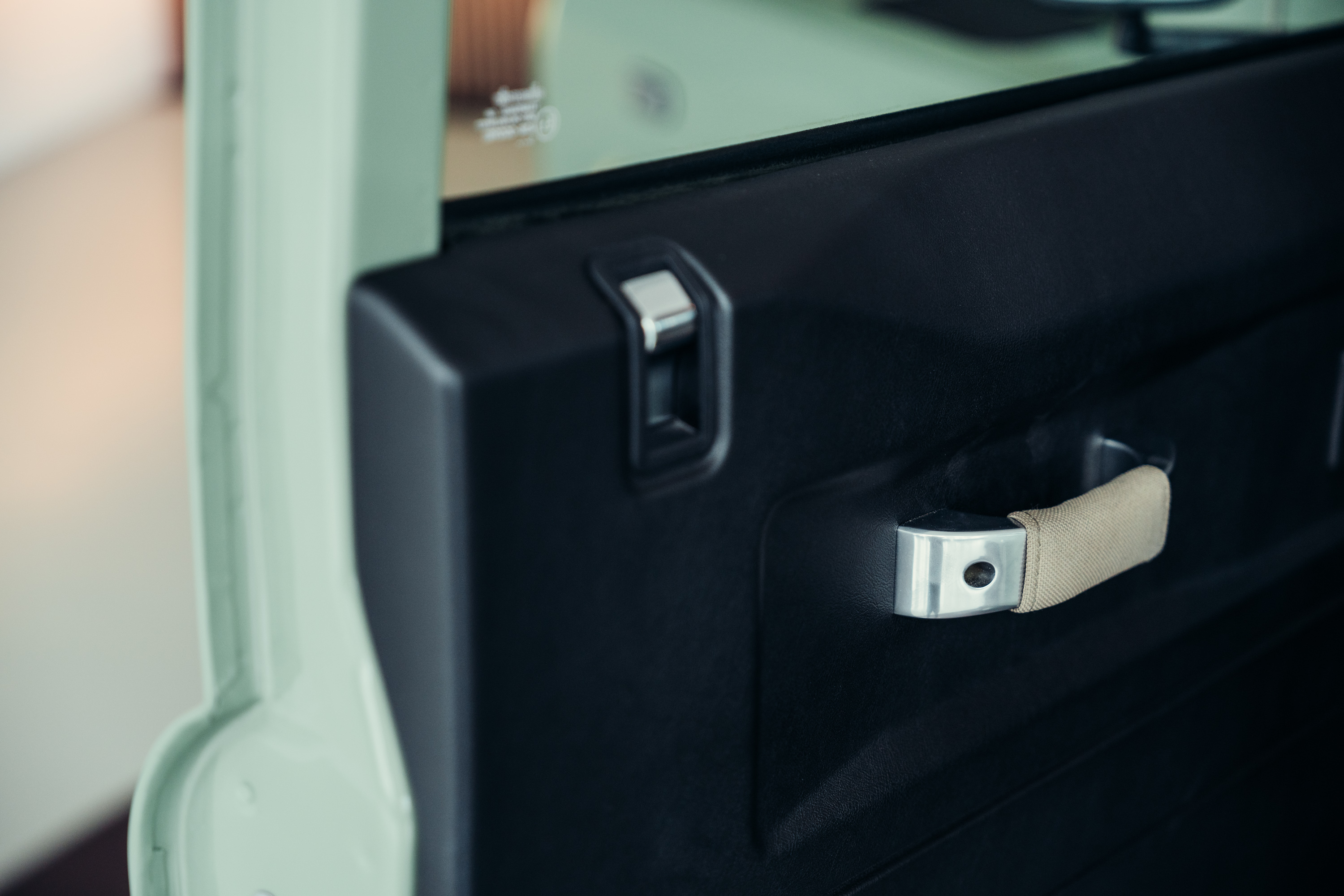 Interior door handles in light aluminium finish and wrapped in Almond fabric